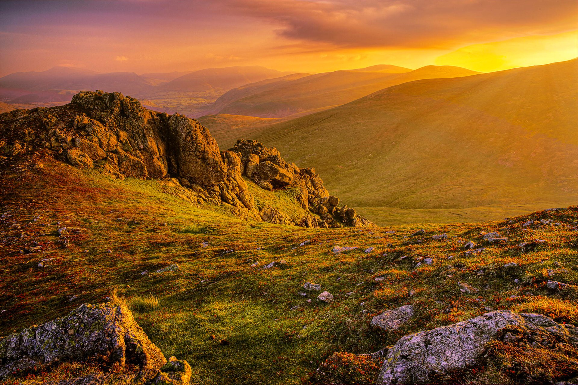 Rocks and mountain hills illuminated by the rays of the departing sunRocks and mountain hills illuminated by the rays of the departing sun