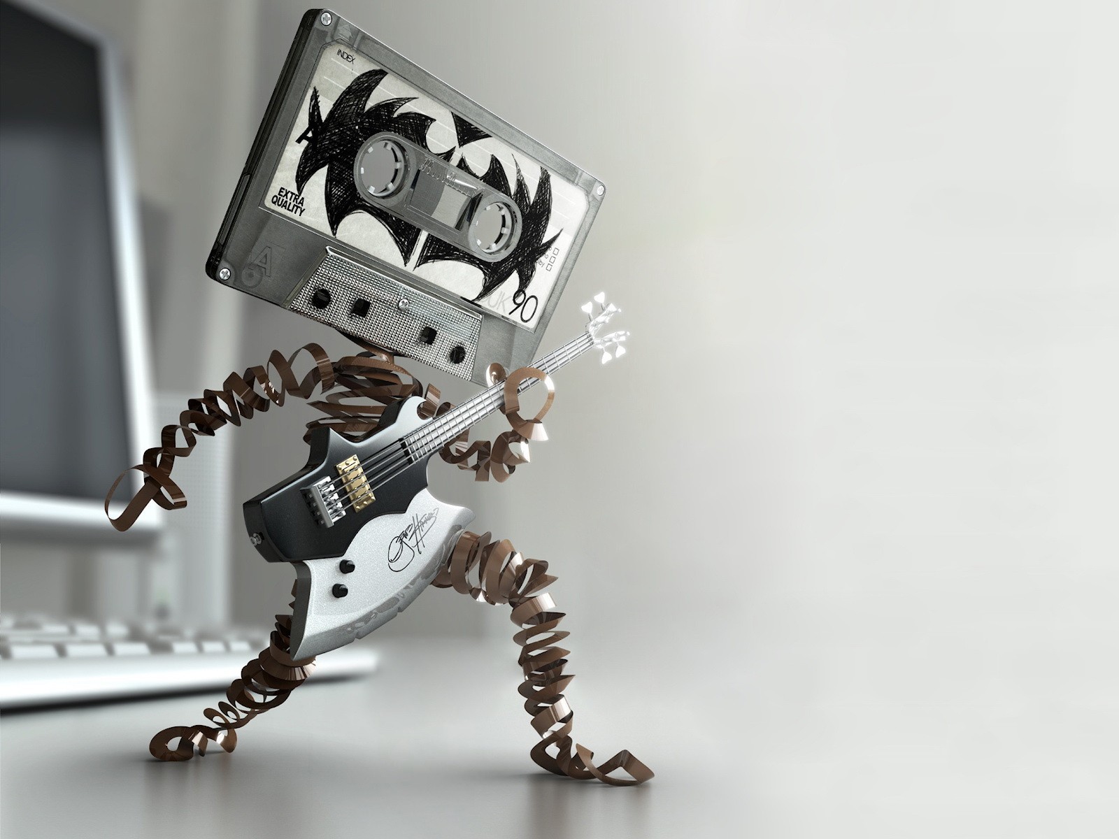 A character with a guitar and a head in the form of a cassetteA character with a guitar and a head in the form of a cassette