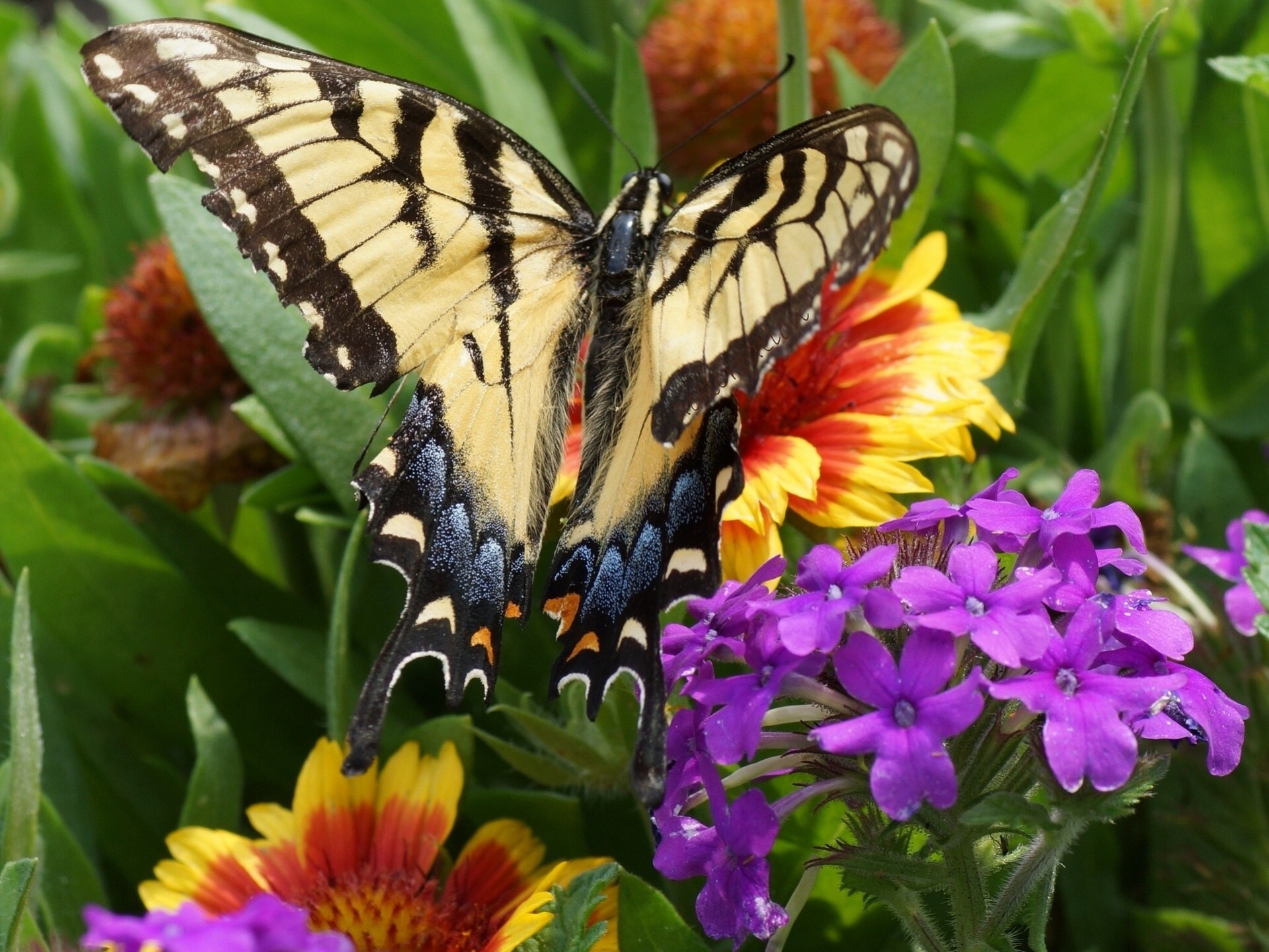 White cat with red spots on a background of flowersWhite cat with red spots on a background of flowers