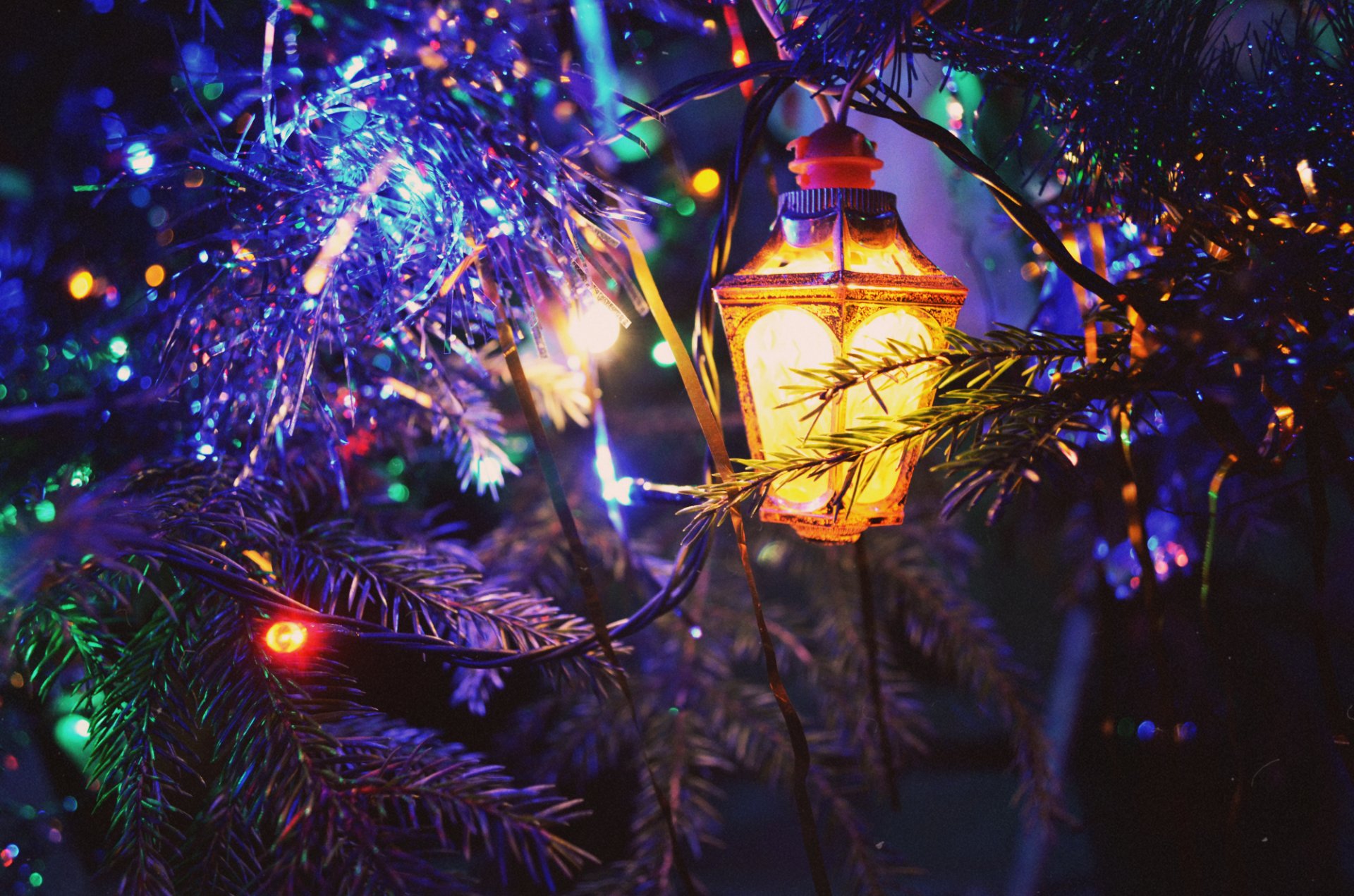 Christmas tree with tinsel and bright garland