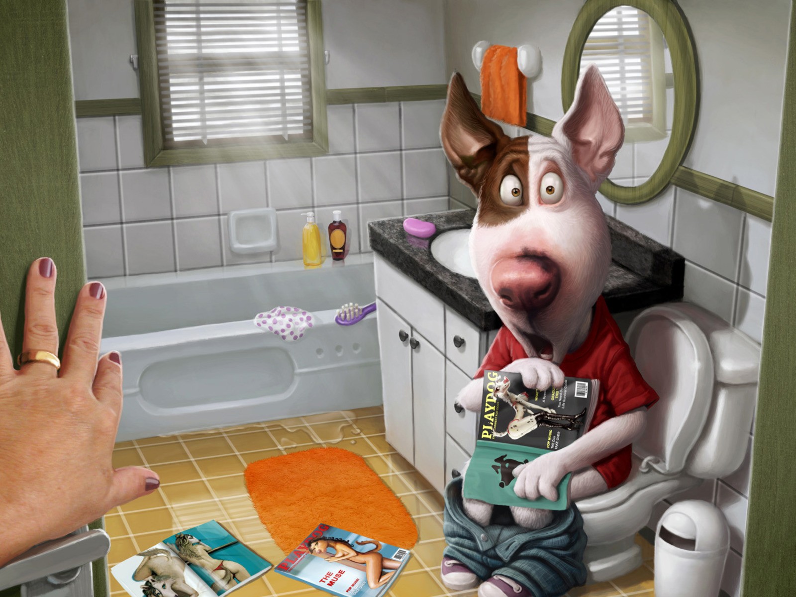 The dog got caught on the toilet with a magazine