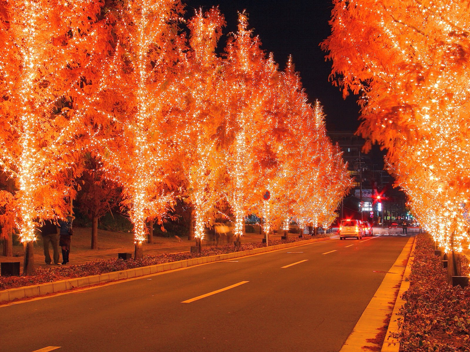 Red illumination of trees along the road