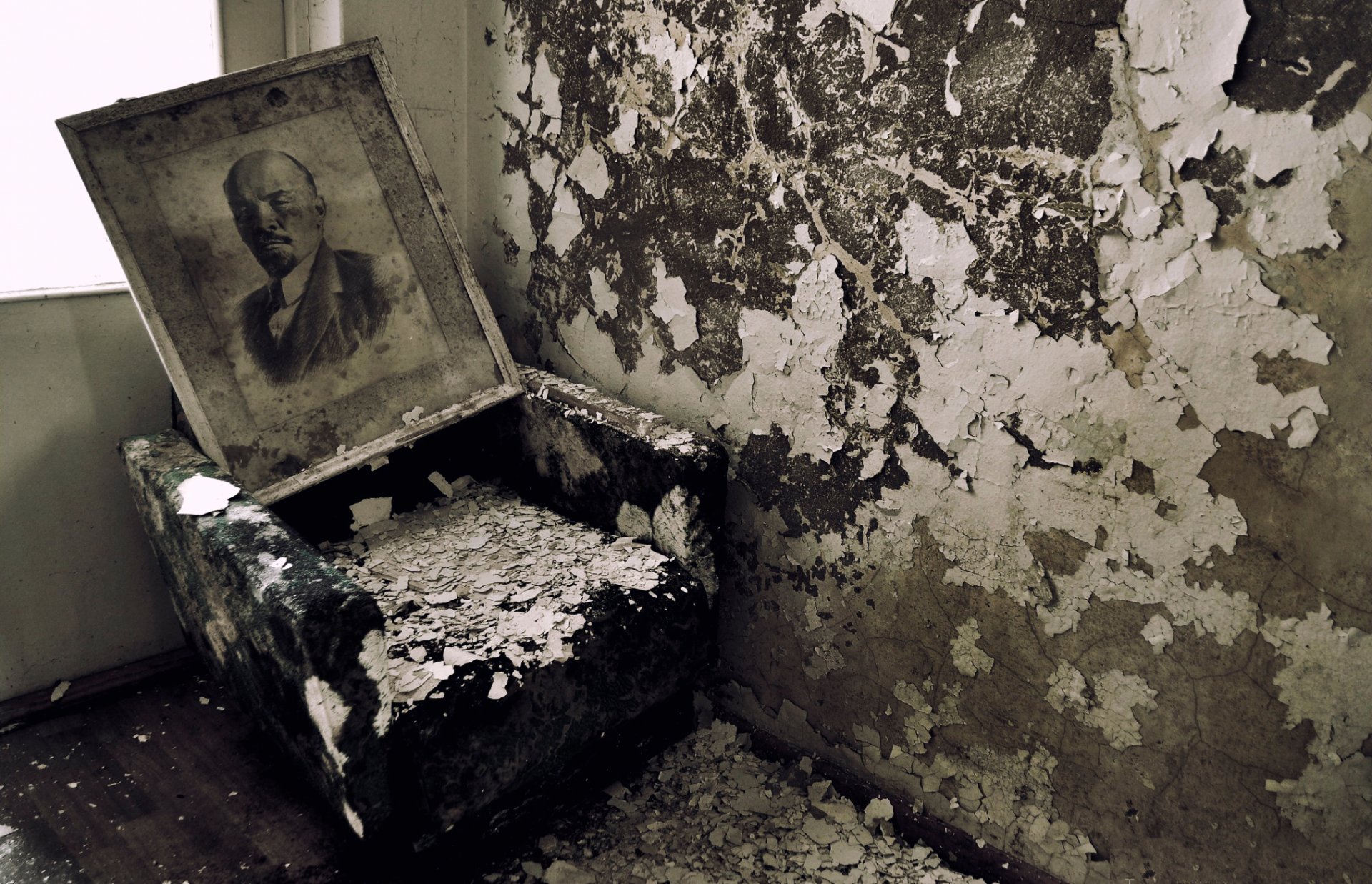 A girl on the threshold of an abandoned house, apples on the ground and black birds