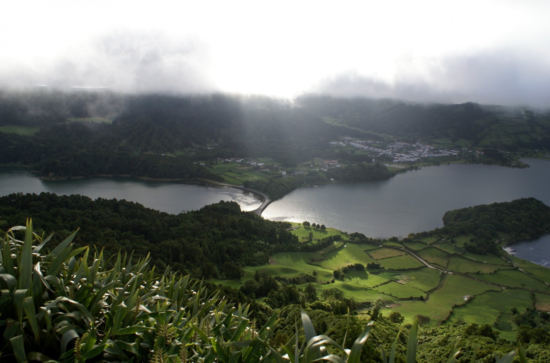 Large clouds over the path in green grass and treesLarge clouds over the path in green grass and trees