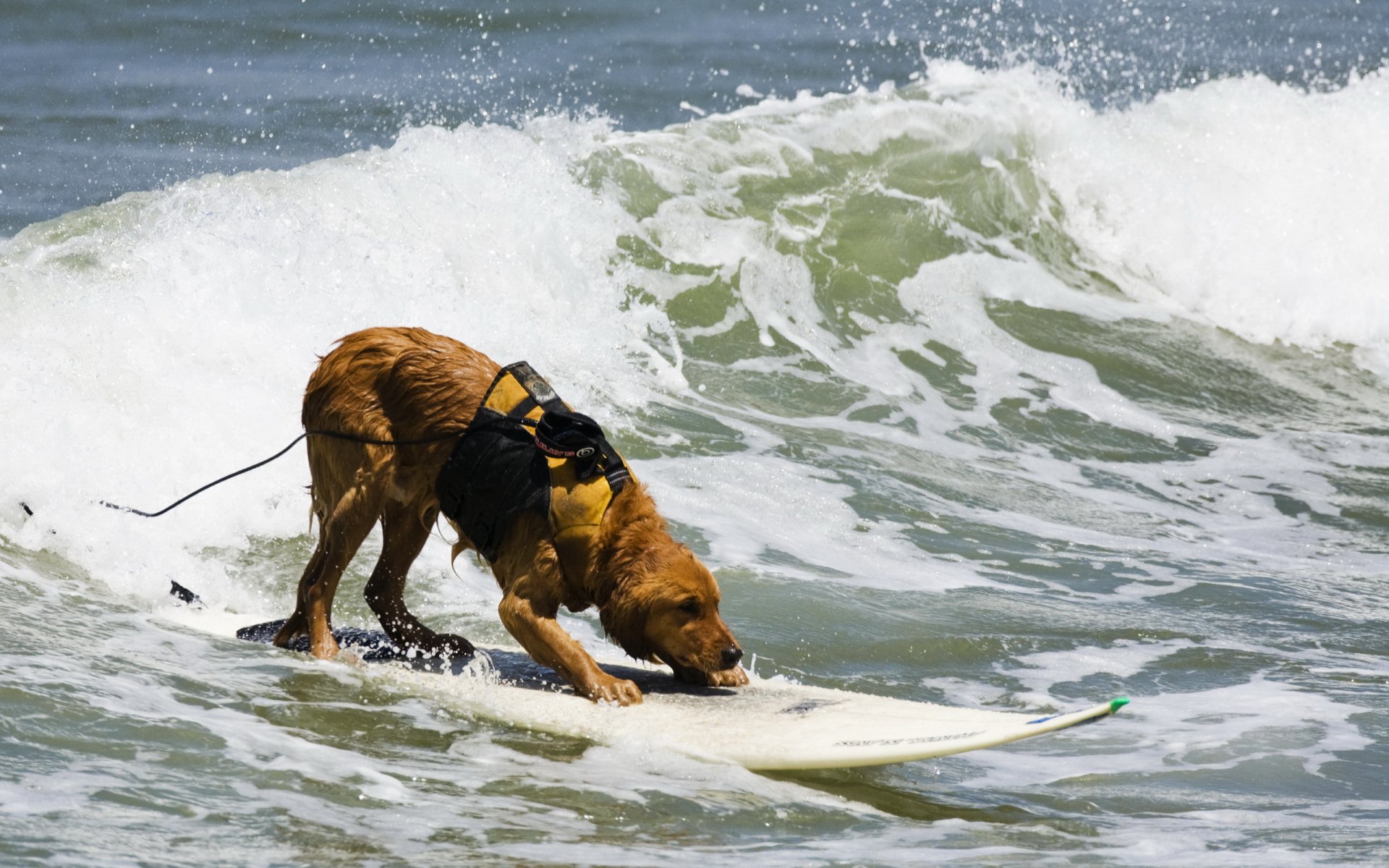 The dog on the board catches a wave