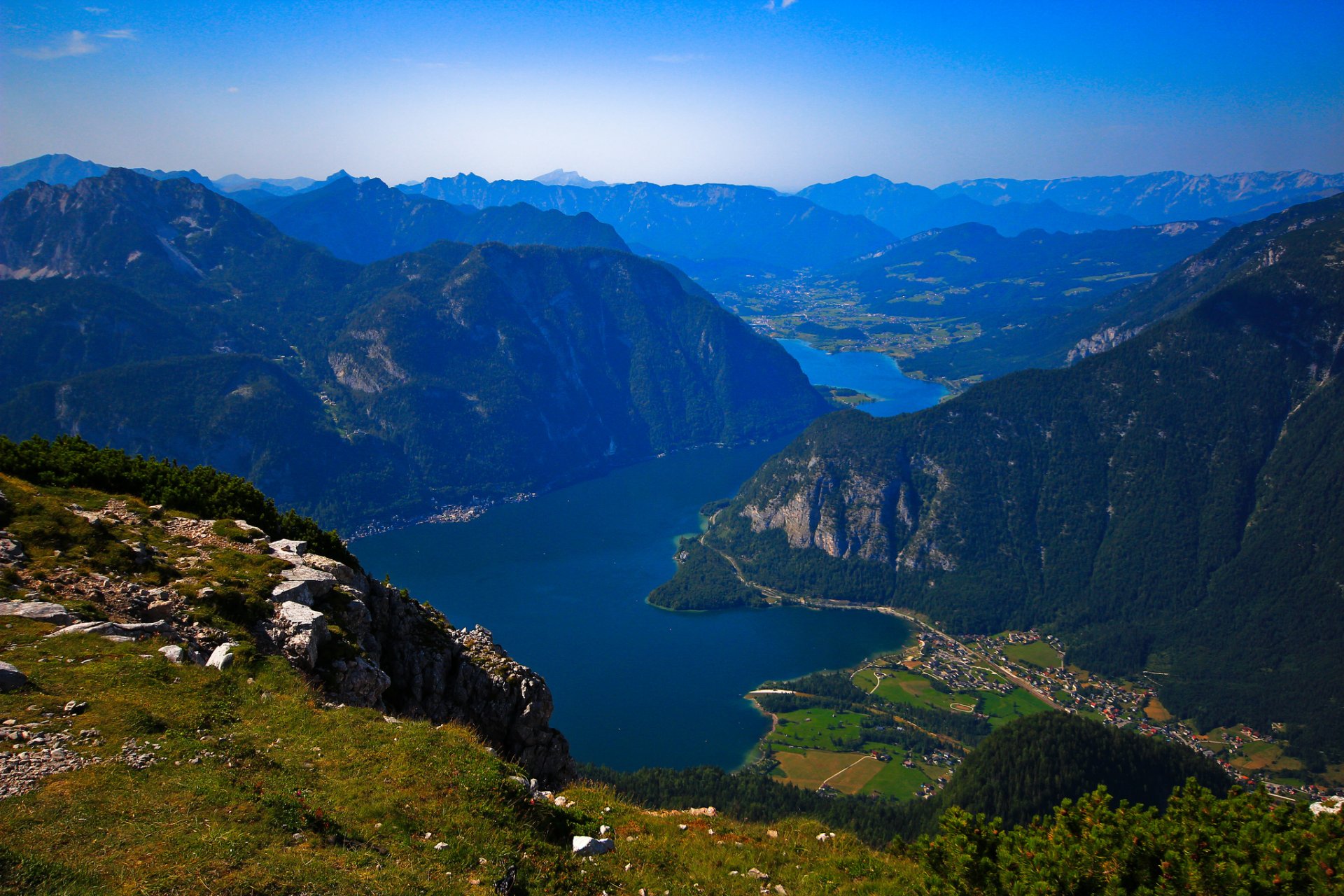 Among the trees you can see a high mountain and a lake in which a boatAmong the trees you can see a high mountain and a lake in which a boat