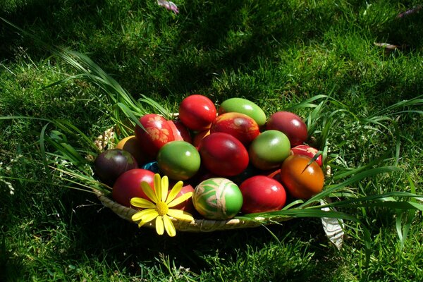 An unusual vase made of wire for the Easter holiday with bright eggs