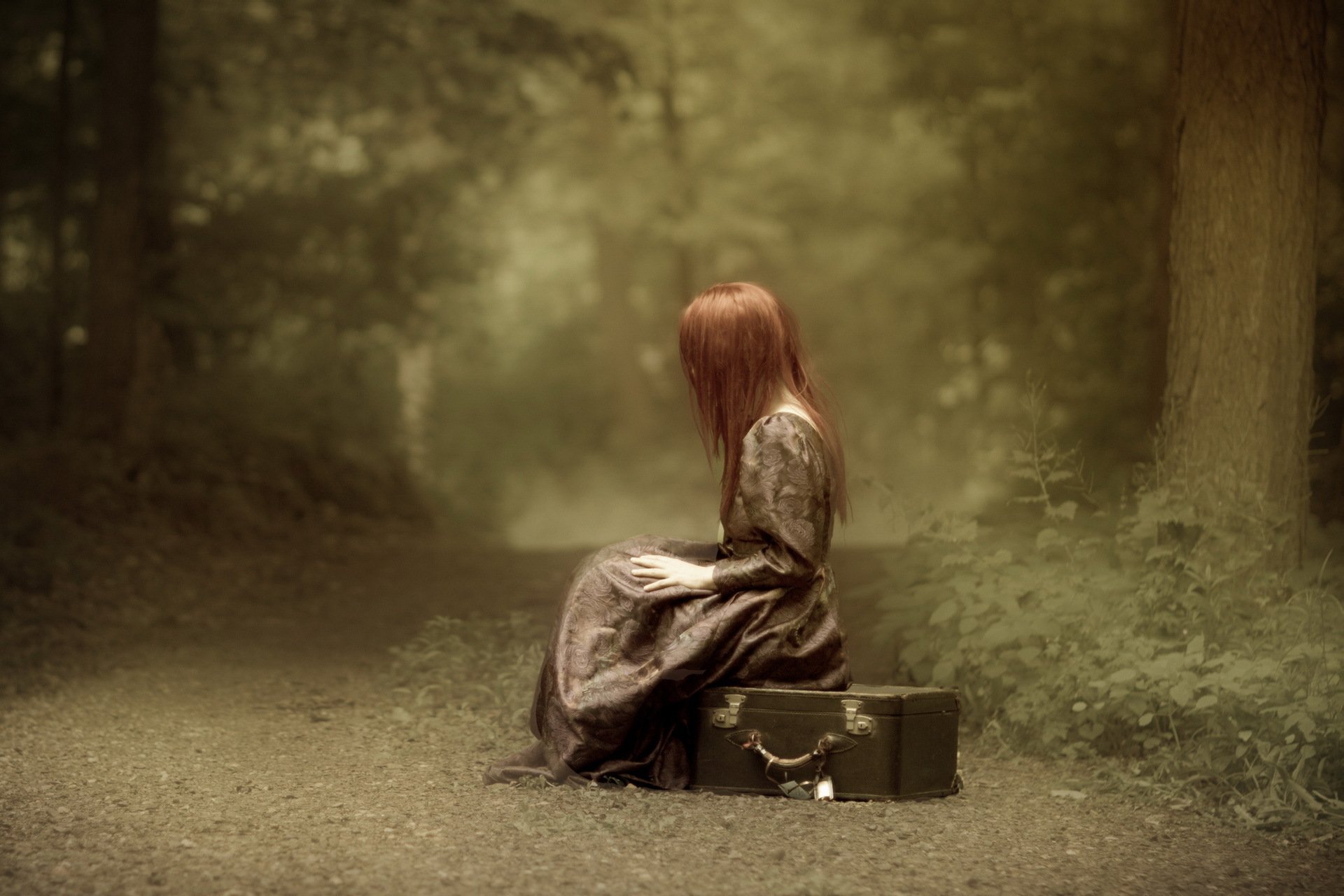 The girl is sitting on a suitcase on the side of the roadThe girl is sitting on a suitcase on the side of the road