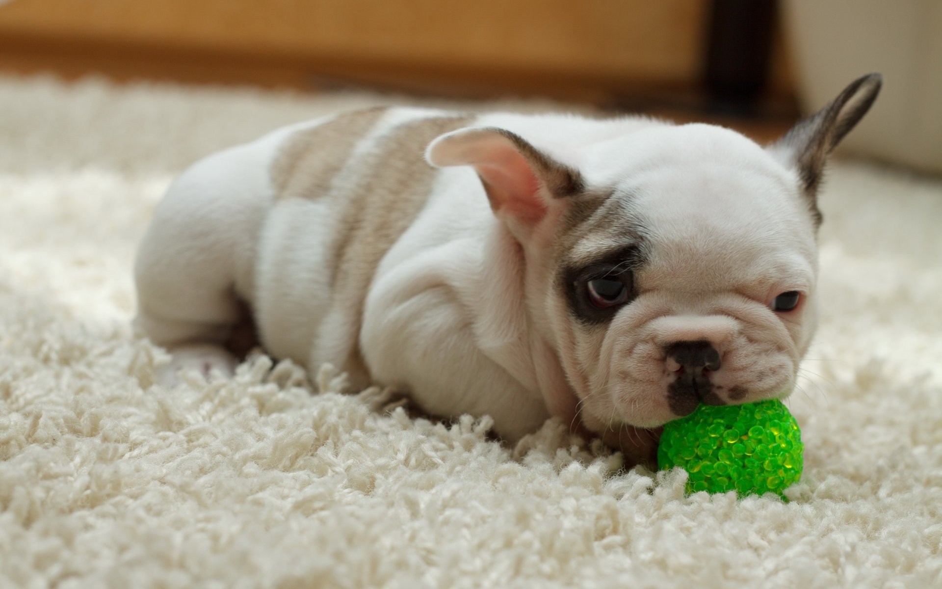 A puppy with a green ball in his teeth