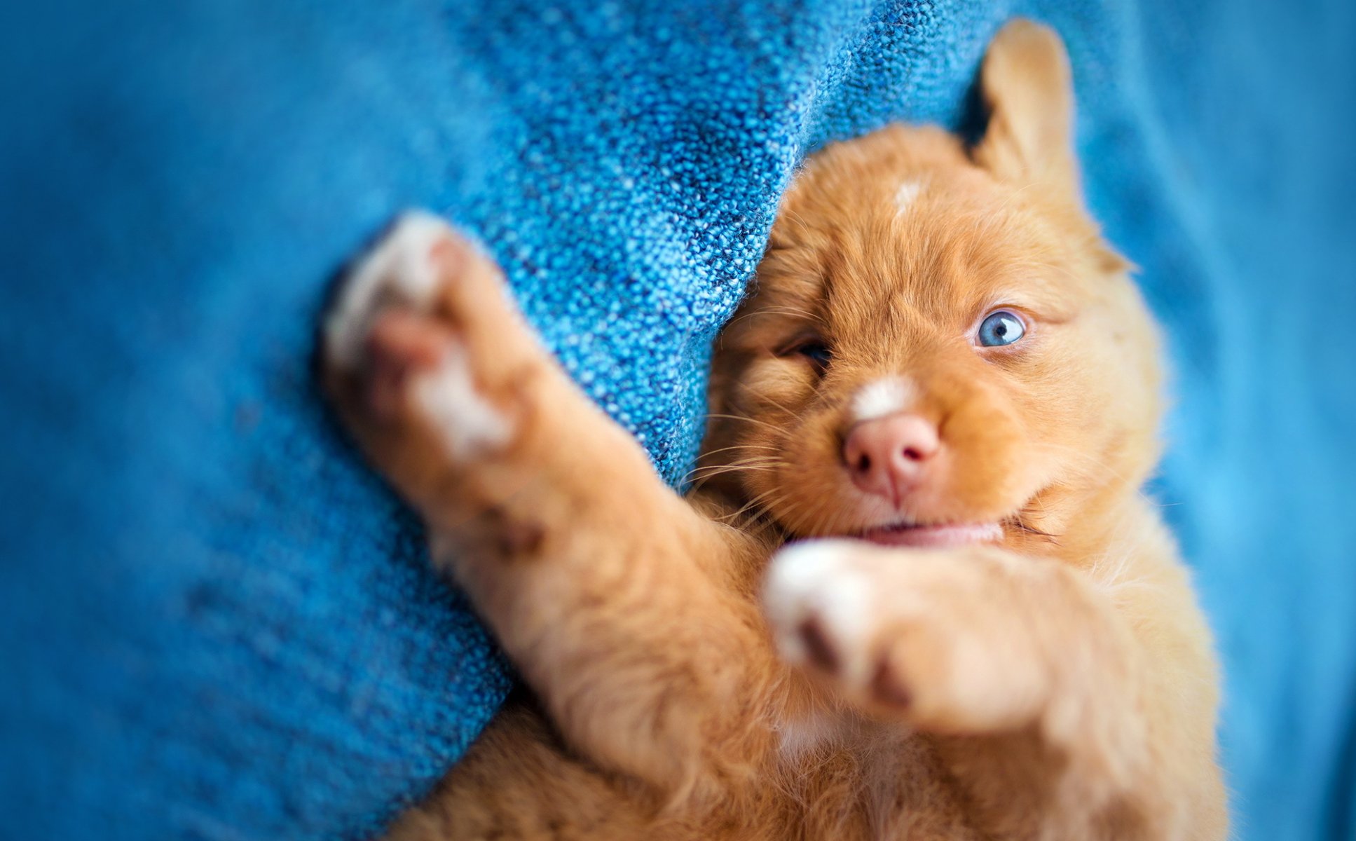 A red-haired puppy with blue eyes