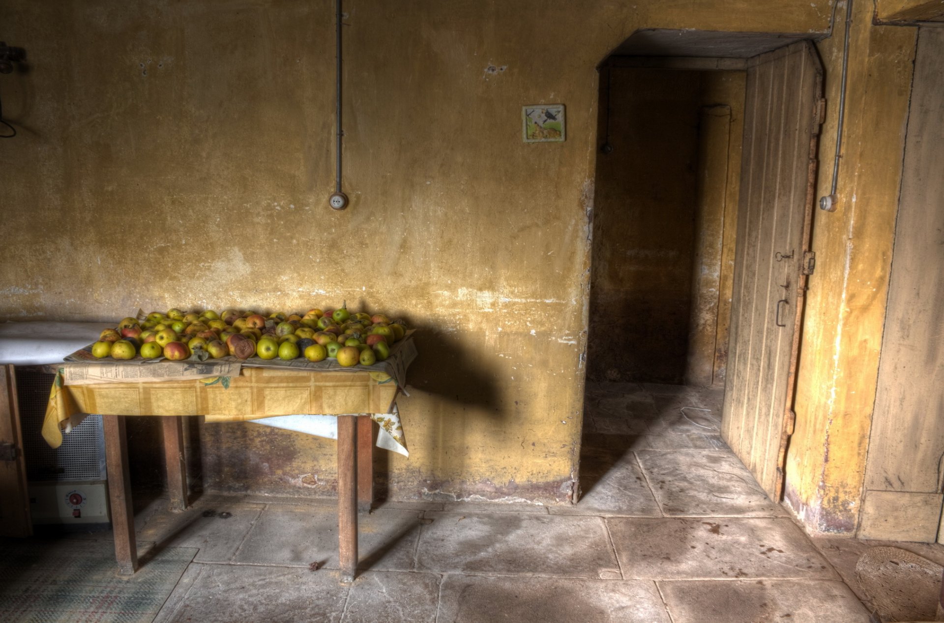 A red twisted candle burns among cherries in a basket and apples on a wooden shelf