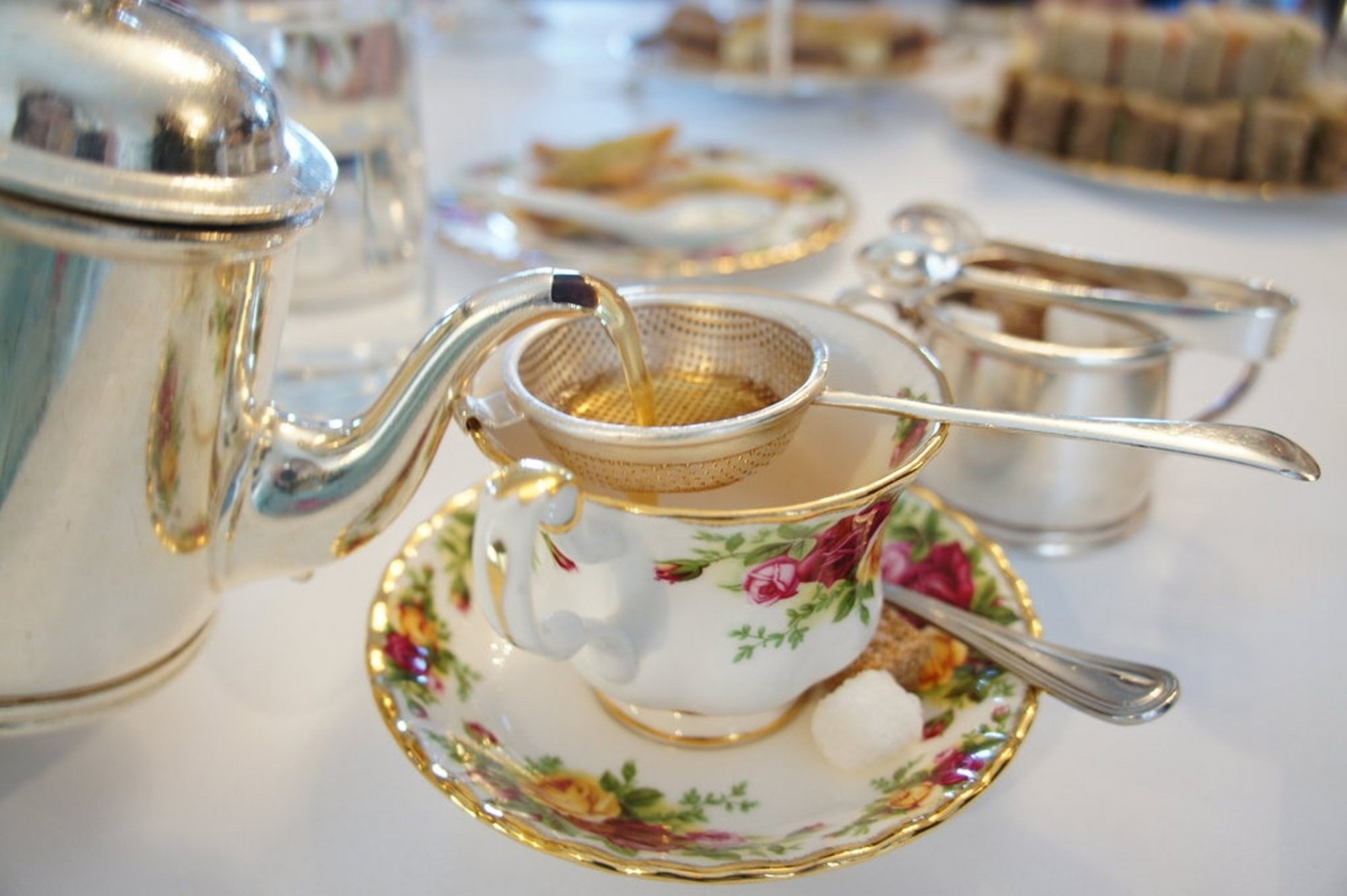 In a cup of tea, pour the tea leaves through a strainerIn a cup of tea, pour the tea leaves through a strainer
