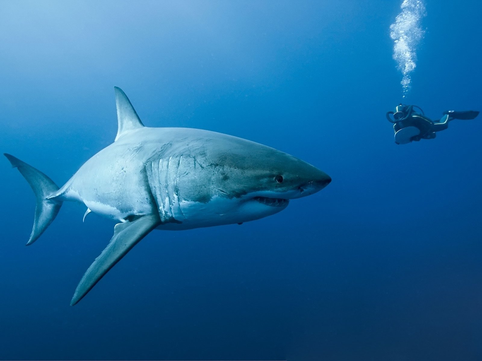 Among the raging sea waves, a man on a raft, there are many sharks under the waterAmong the raging sea waves, a man on a raft, there are many sharks under the water
