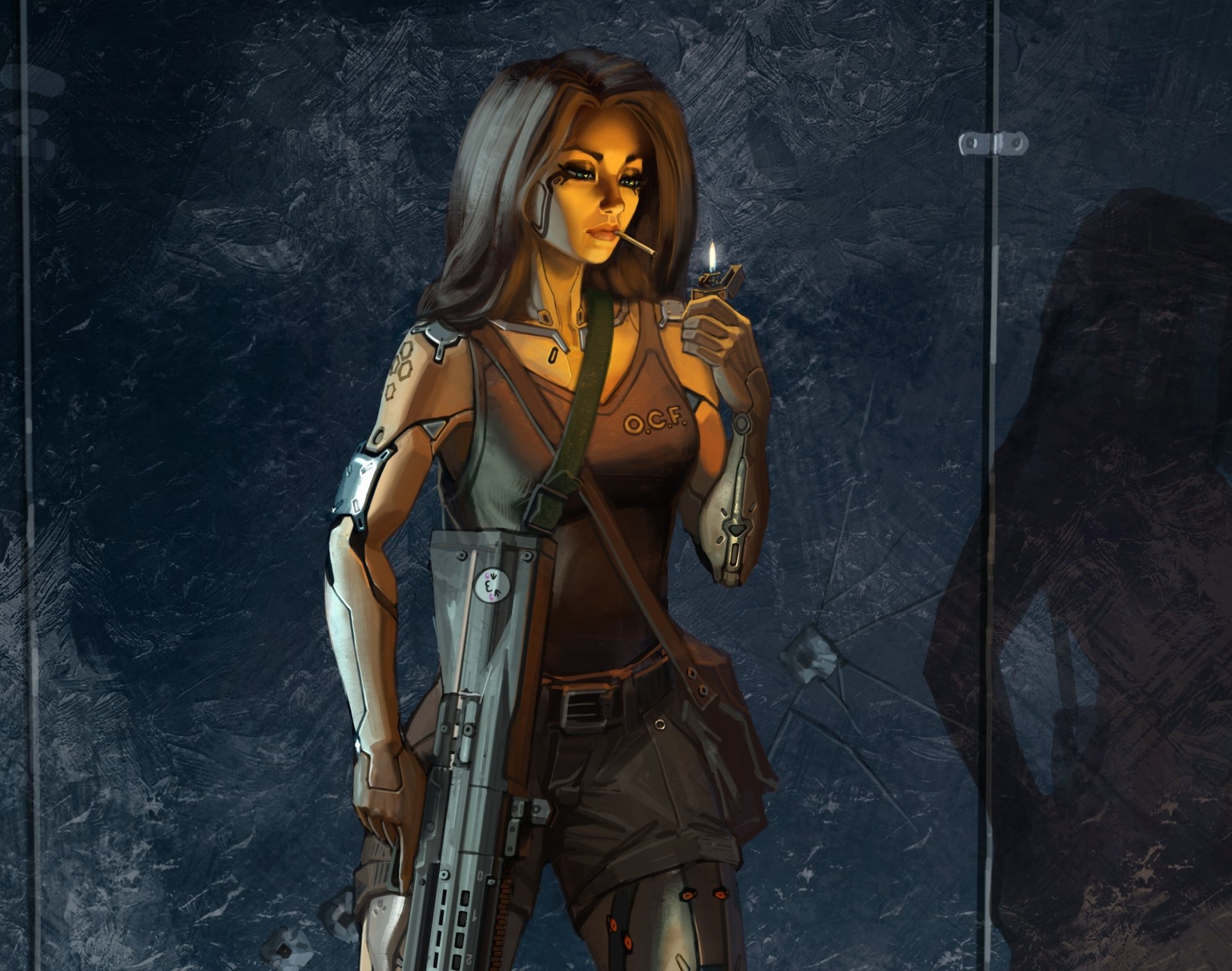 A girl with a machine gun in her hands smokes a cigaretteA girl with a machine gun in her hands smokes a cigarette