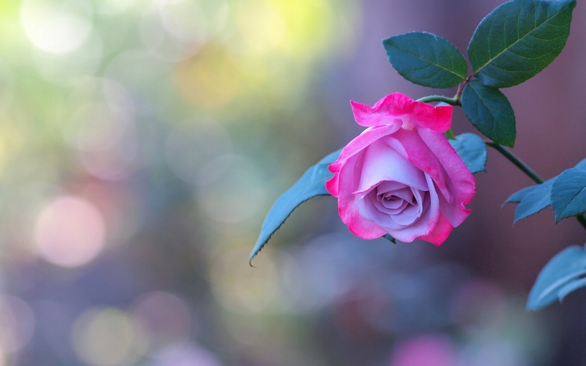 A blooming bud of a delicate rose on a colored blurred backgroundA blooming bud of a delicate rose on a colored blurred background
