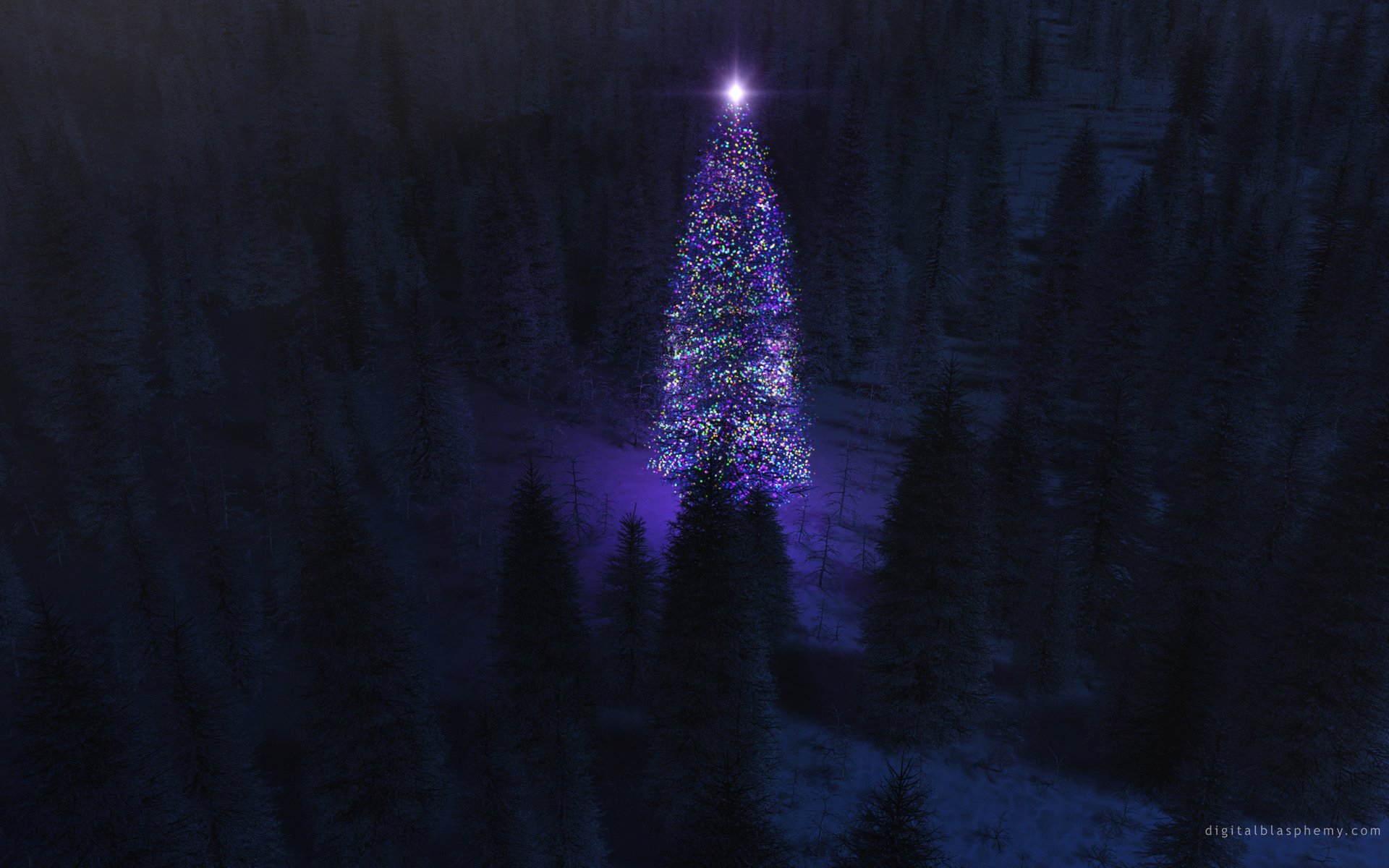 Christmas tree with lights at night in a dark forestChristmas tree with lights at night in a dark forest