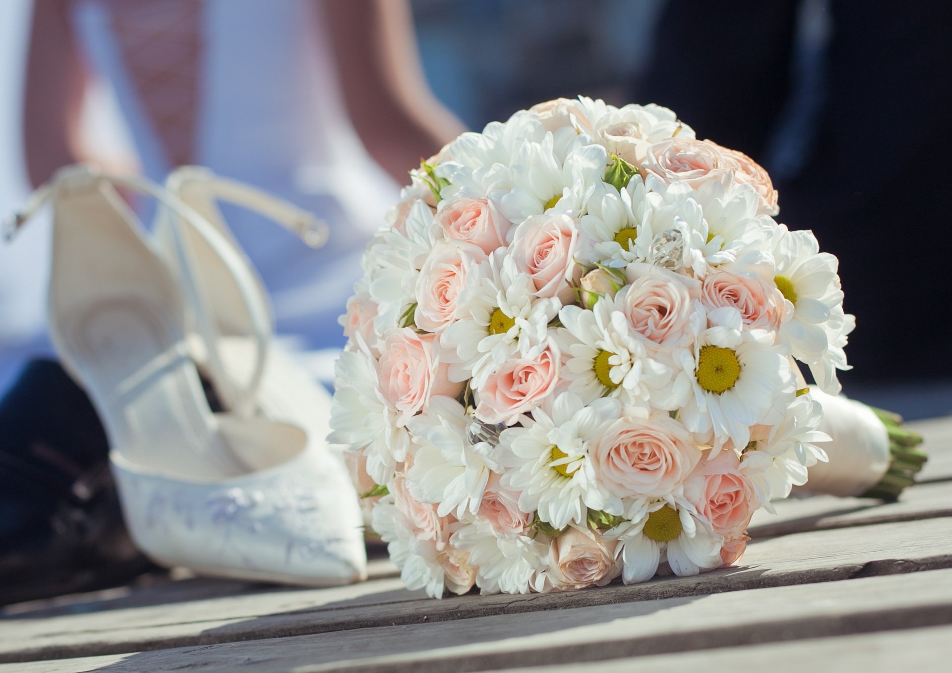Still-life. A bouquet of roses and a tea set on a snow-white tablecloth