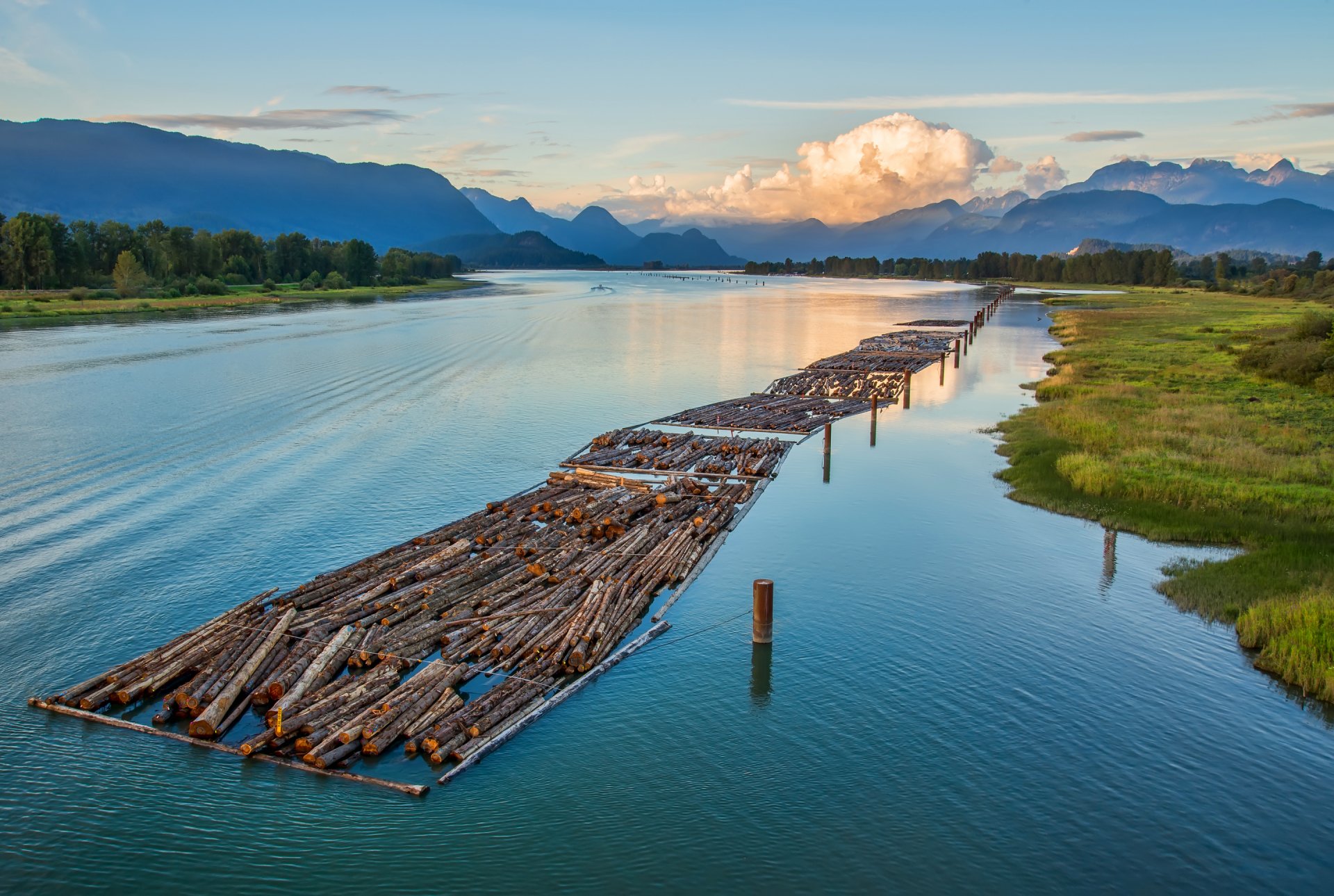 Logs on the water in British Columbia. Forest and mountains on the horizon