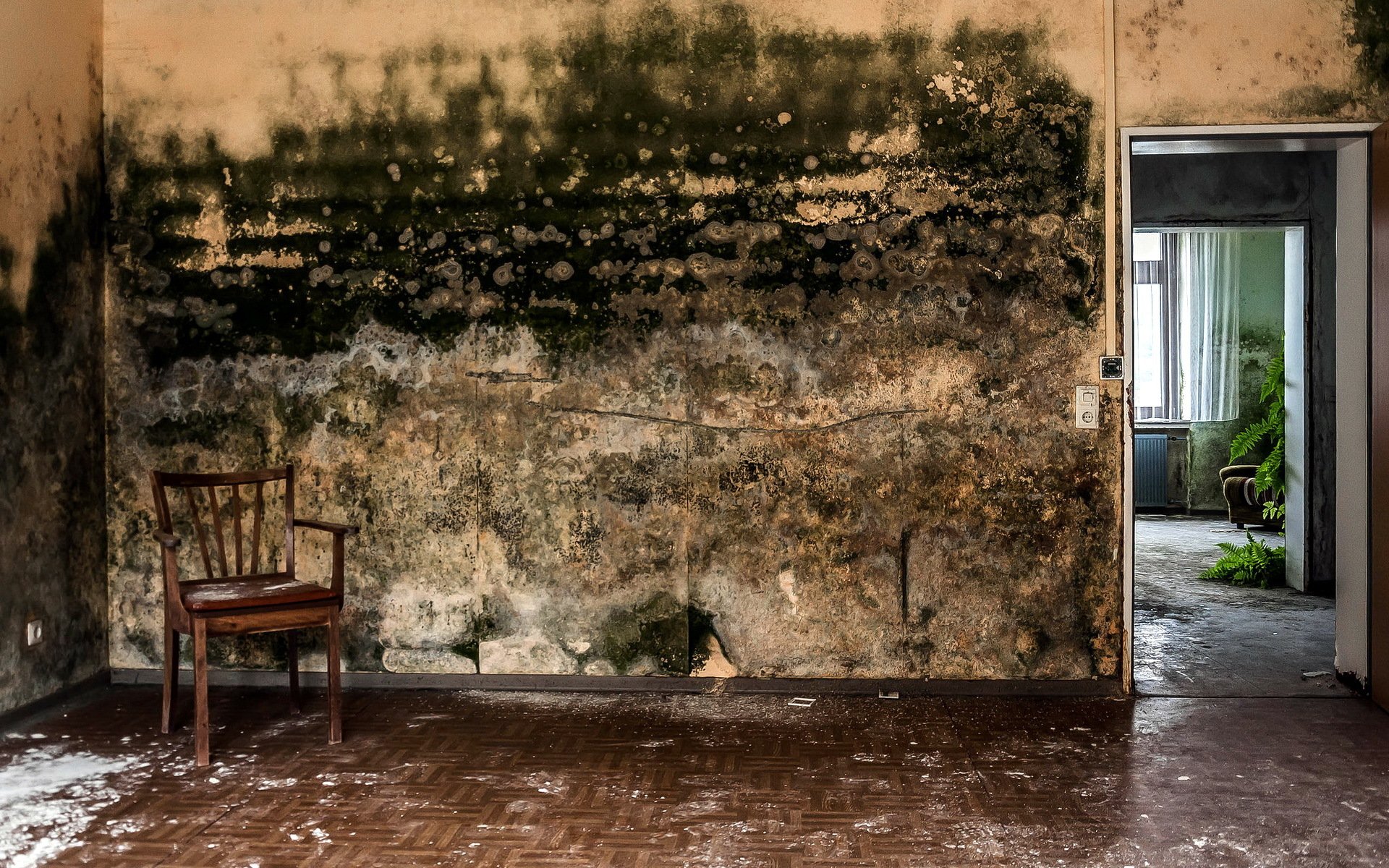 A house abandoned by people with broken windows, an unmade bed and shelves with the remaining dishes in black and white