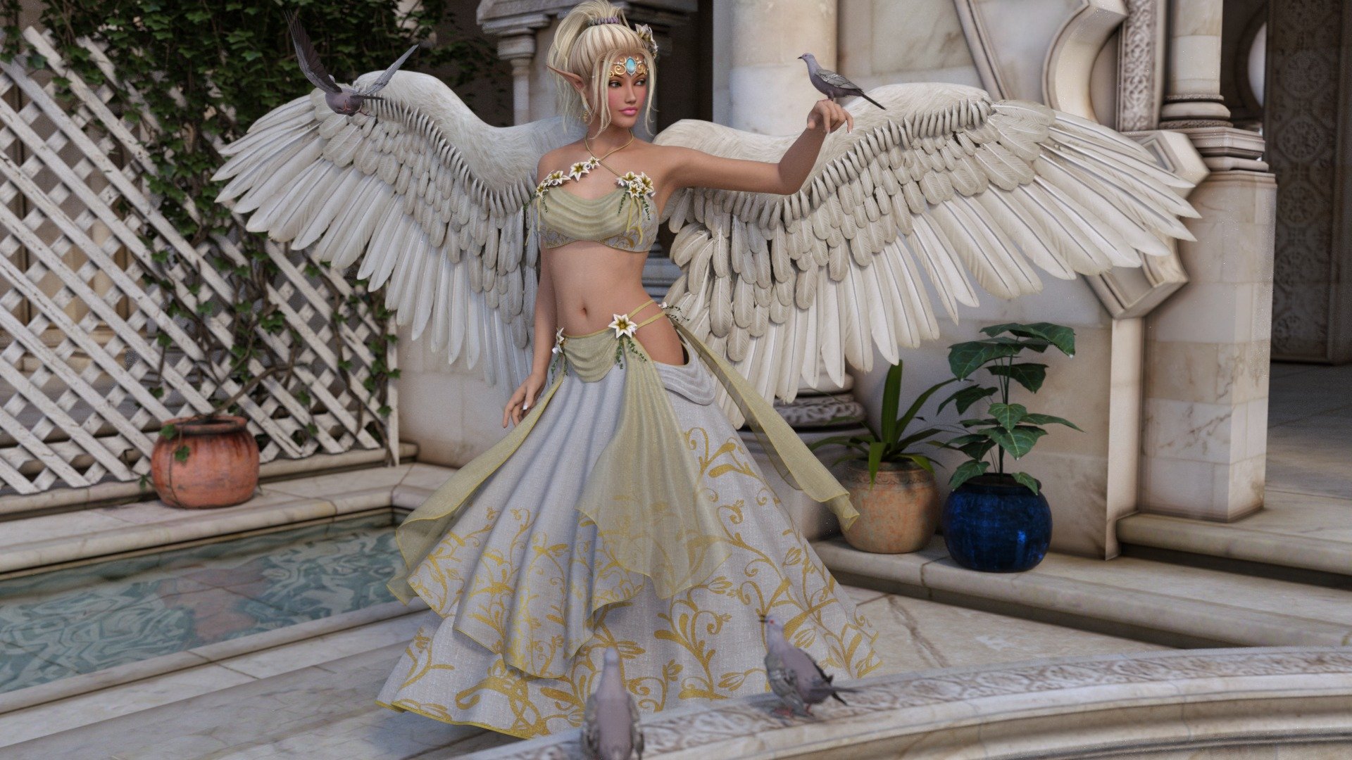 A girl in a wreath of flowers and a butterfly on her armA girl in a wreath of flowers and a butterfly on her arm