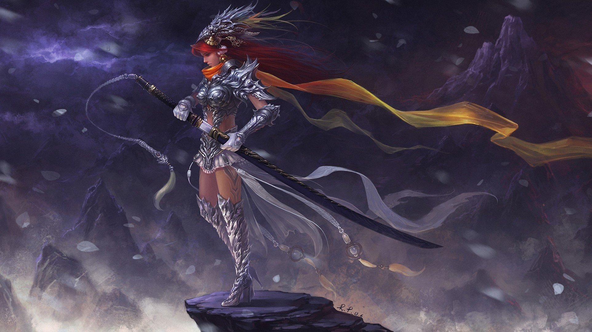 The heroine is not a rock, a girl with a sword on a rock, a girl with a ball on a rock, a fantasy girl has a sword