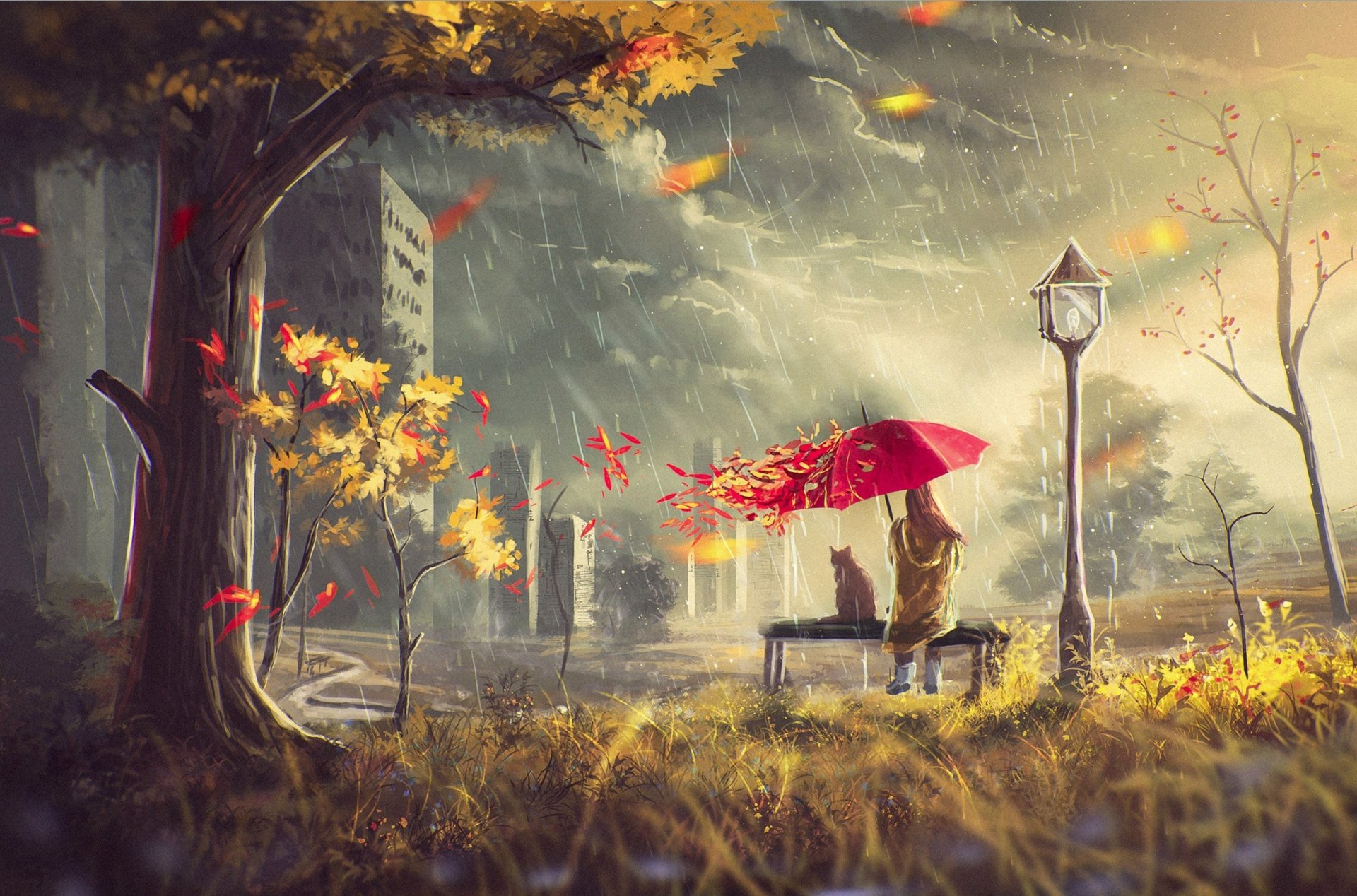 A girl under an umbrella with a cat on a bench. autumn pictureA girl under an umbrella with a cat on a bench. Autumn picture