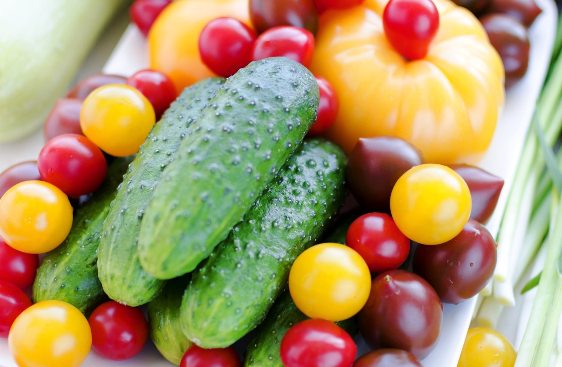 Colorful multicolored cherry tomatoes and cucumbersColorful multicolored Cherry tomatoes and cucumbers