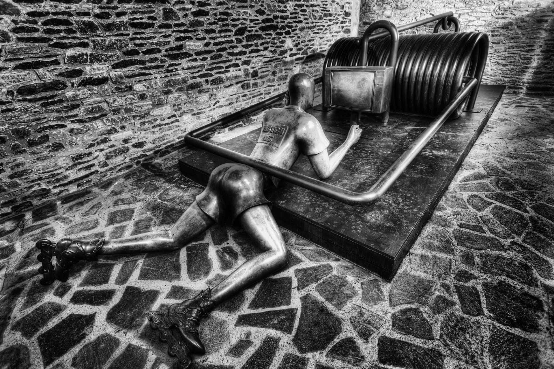 Sculpture of a man trapped in a mousetrap