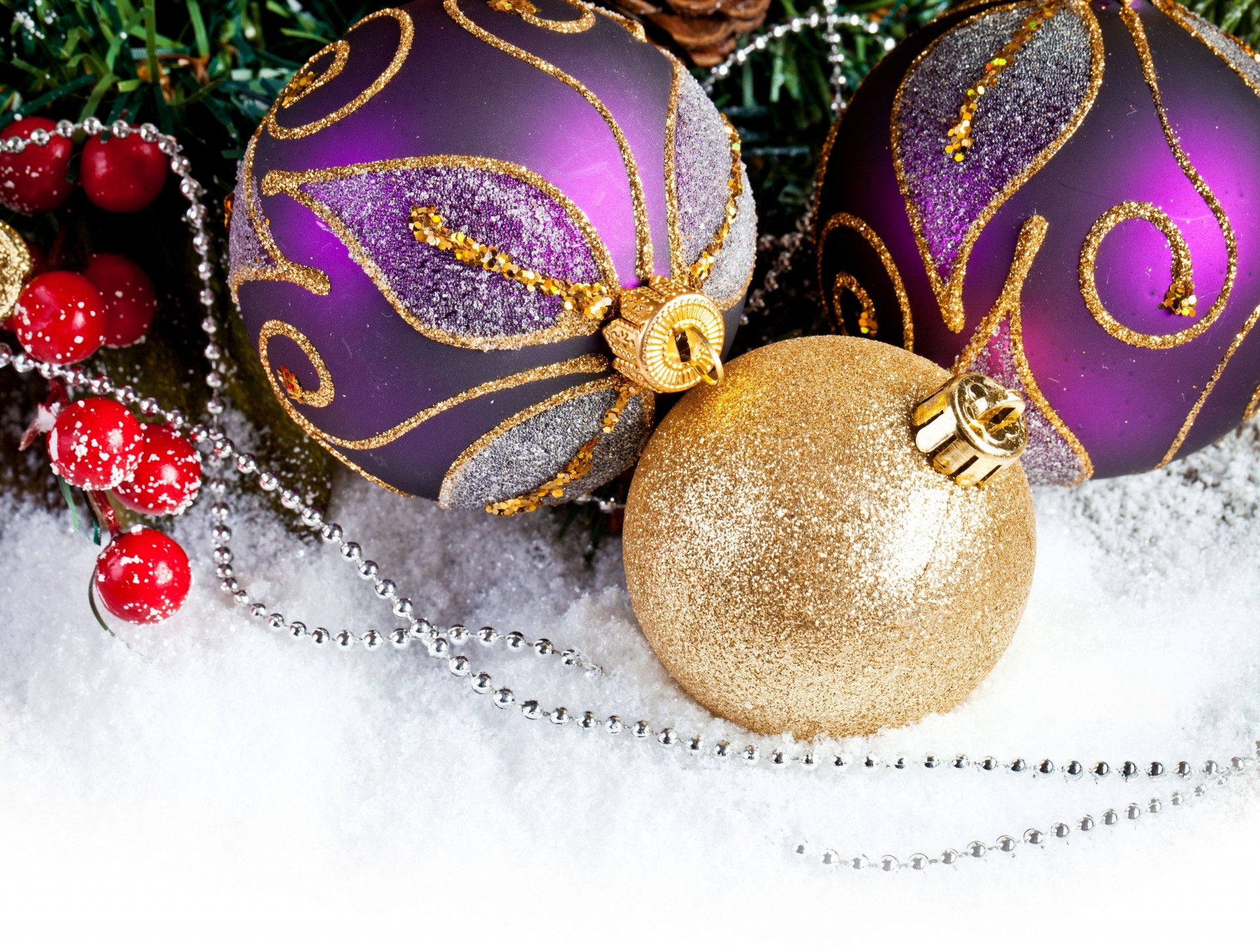 Golden balls on a branch of a fir tree against the background of snowGolden balls on a branch of a fir tree against the background of snow