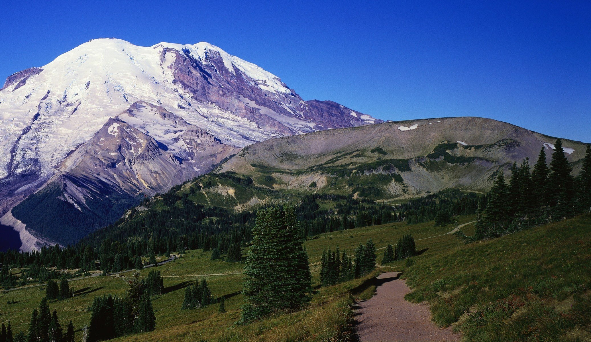 A snowy mountain and a road with trees leading to itA snowy mountain and a road with trees leading to it