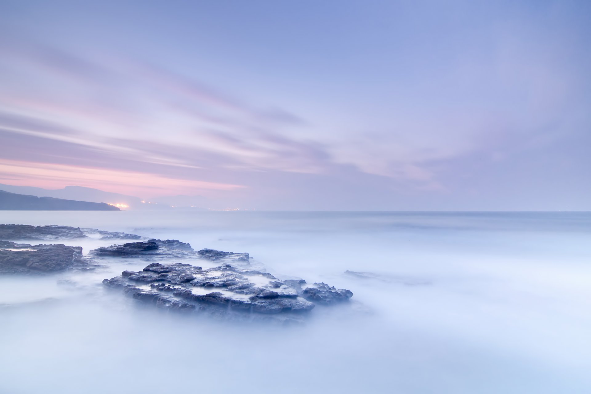 Misty dawn over rocks in the ocean