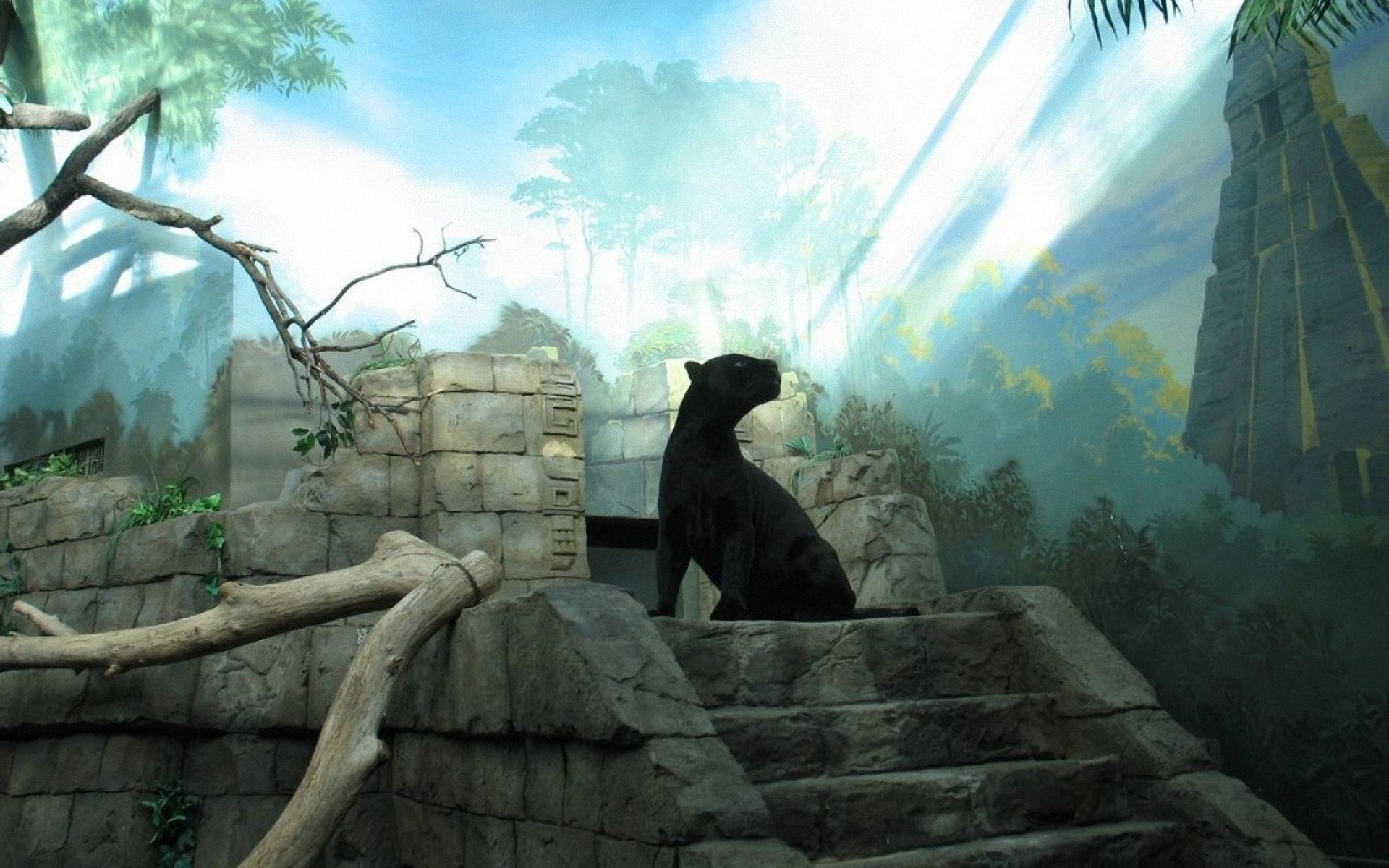 The black panther is sitting in ruins on the stairsThe Black panther is sitting in ruins on the stairs