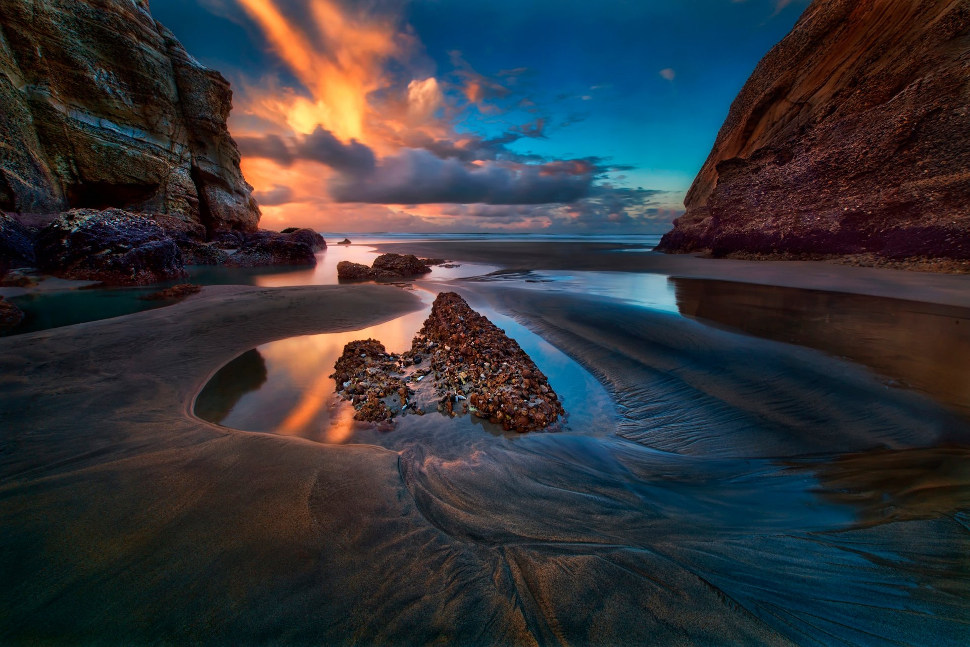 Stone beach. The dawn is reflected in the sea. Beautiful landscape