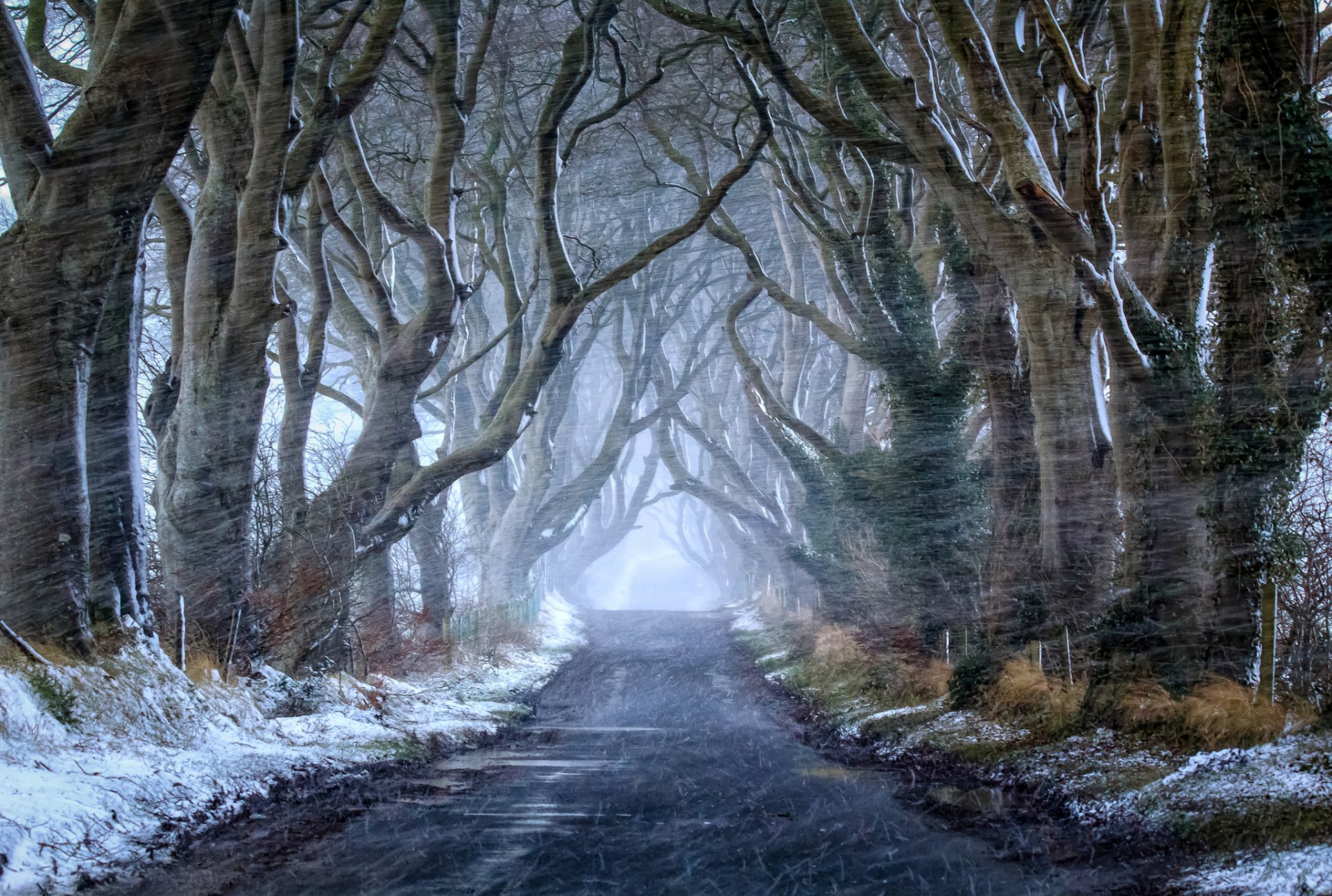 Winter wind walk along the snowy alley