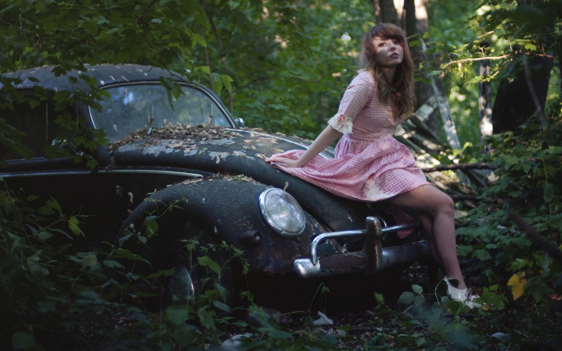 Romantic girl on an abandoned retro car in the woods