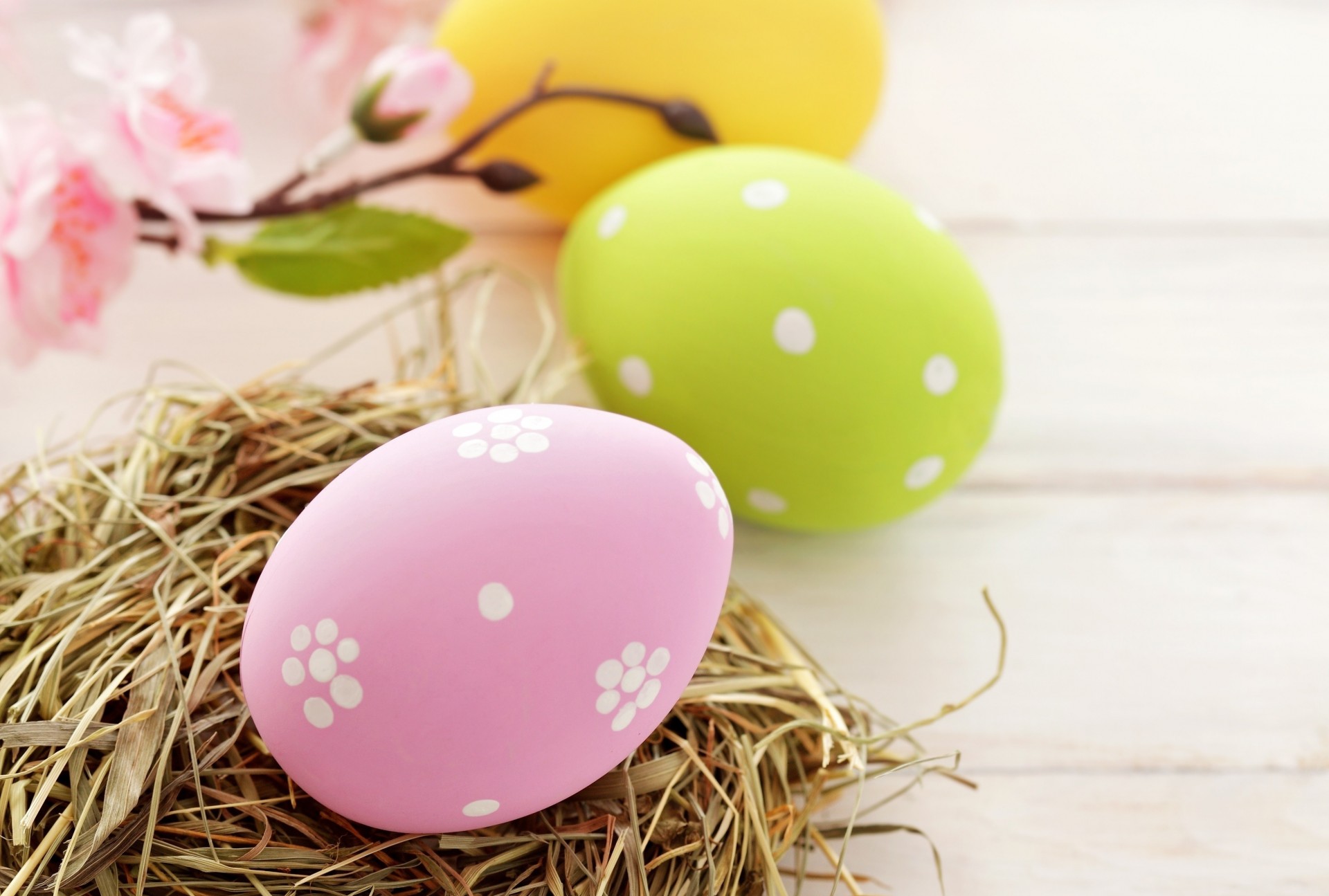 Colorful easter eggs on straw. branch with flowersColorful Easter eggs on straw. Branch with flowers