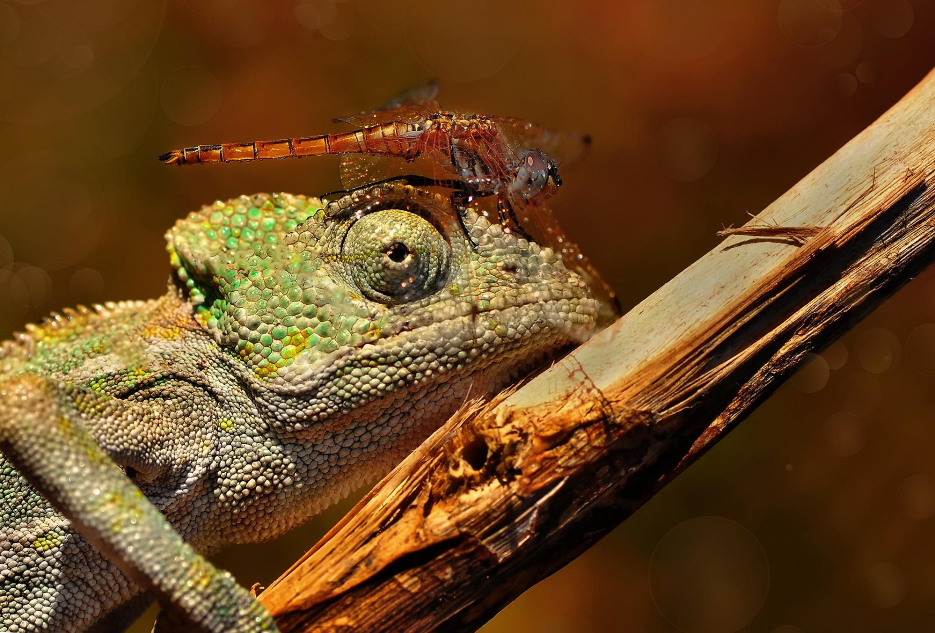 Macro shooting of a dragonfly sitting on the head of a chamelion