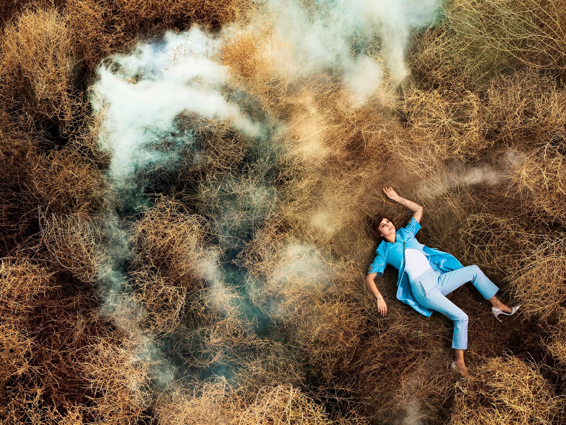Photo of actress marion contillard in a field with smokePhoto of actress Marion Contillard in a field with smoke