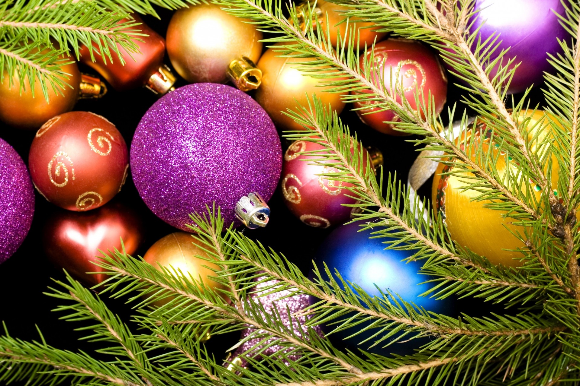 Colorful christmas tree toys framed with fir branchesColorful Christmas tree toys framed with fir branches