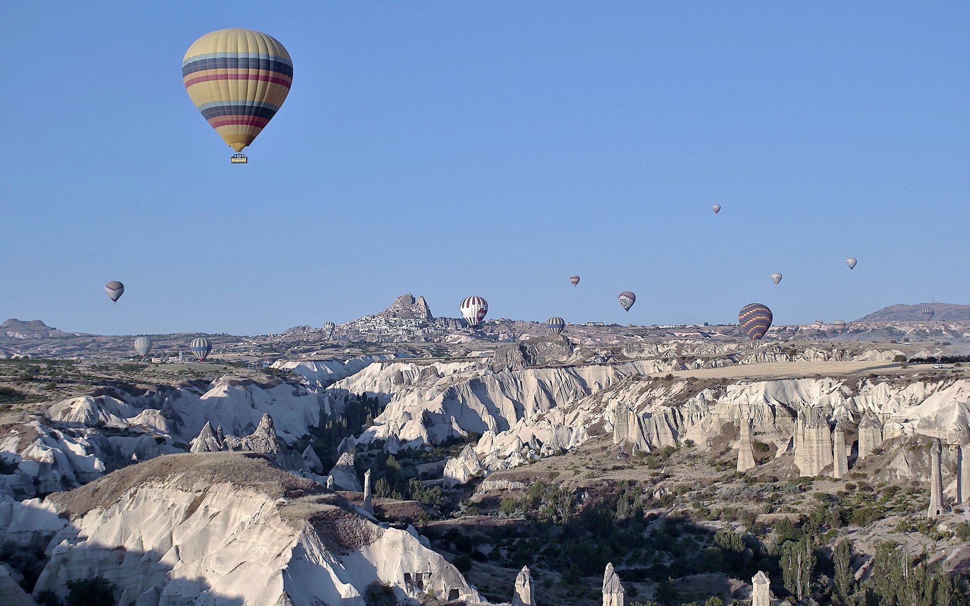 A multicolored balloon is flying against a blue sky backgroundA multicolored balloon is flying against a blue sky background