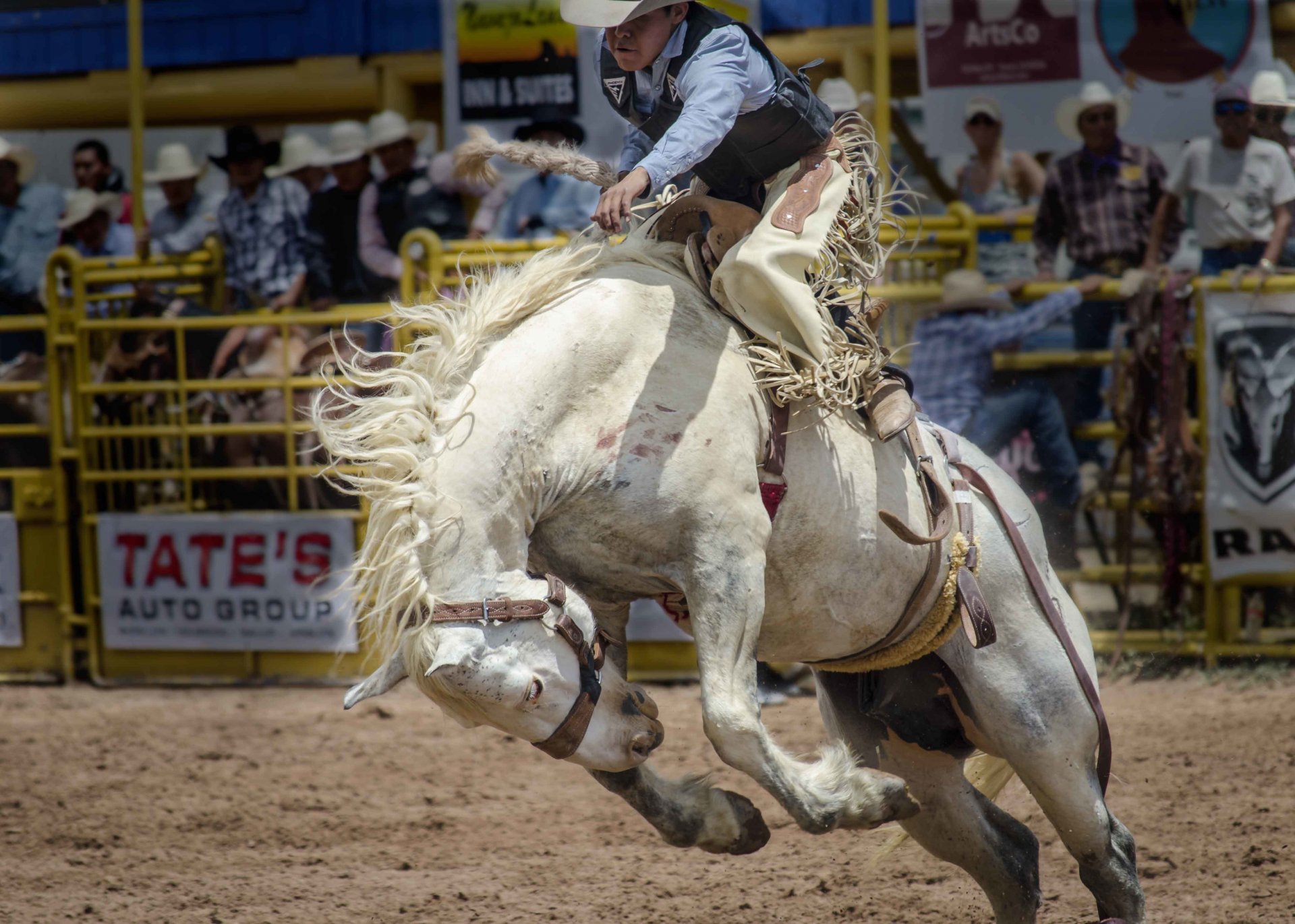 A horse with a rider at a rodeo