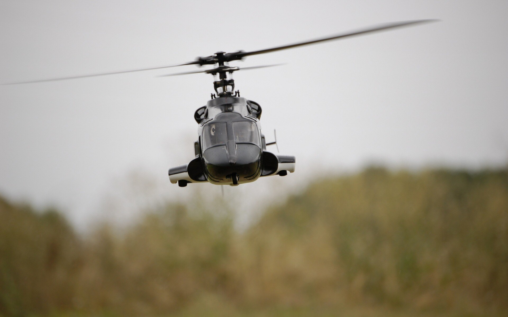 An amphibious helicopter flies over the forest