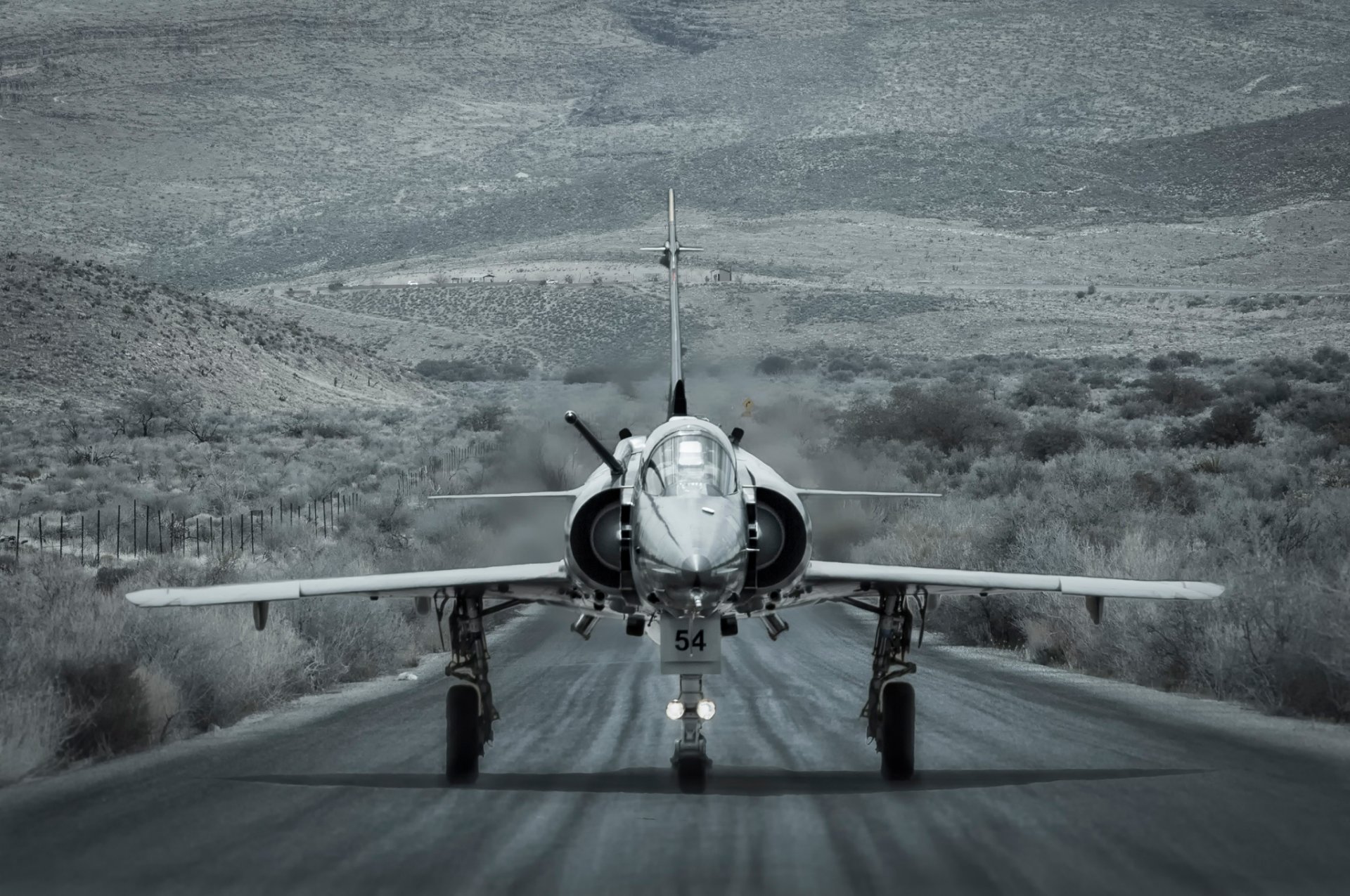A single-seat twin-engine attack aircraft is landing