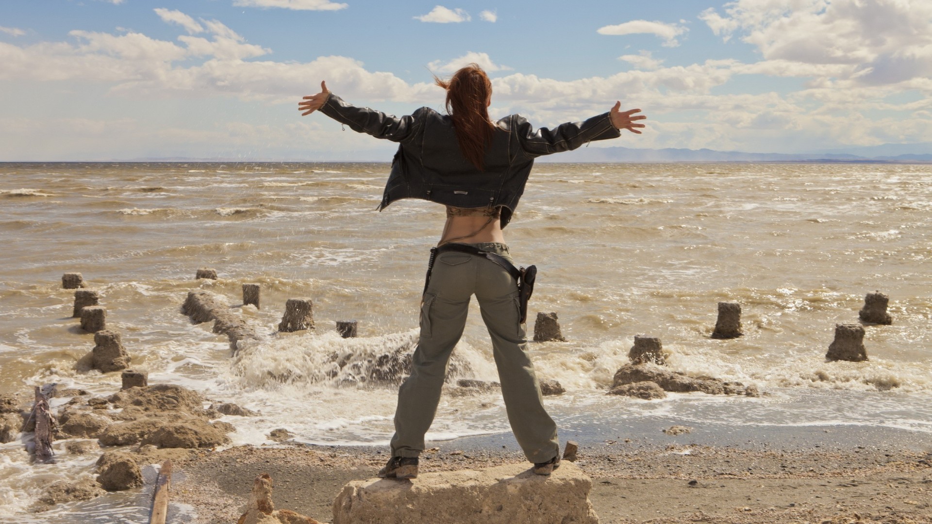 A lifeguard with a shotgun saves girls from an octopus monsterA lifeguard with a shotgun saves girls from an octopus monster