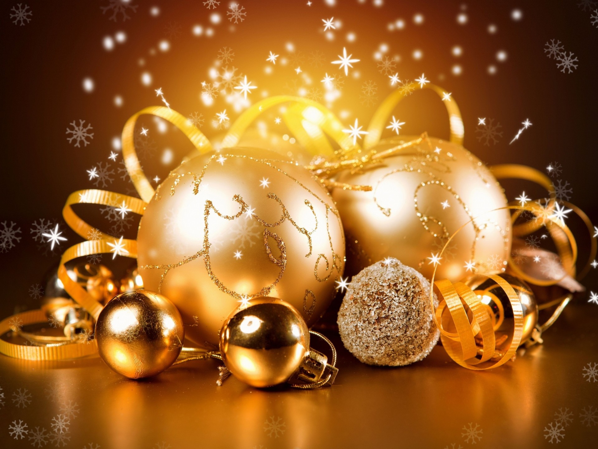 Lit candles and golden christmas balls lying on a table strewn with beadsLit candles and golden Christmas balls lying on a table strewn with beads