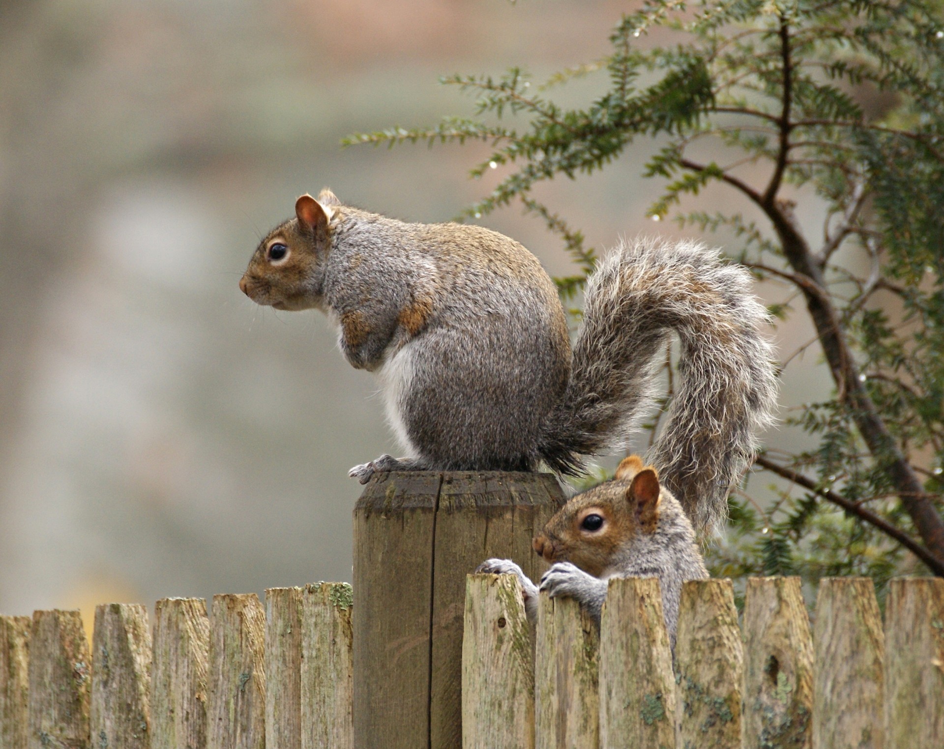 Two squirrels are sitting on the fence