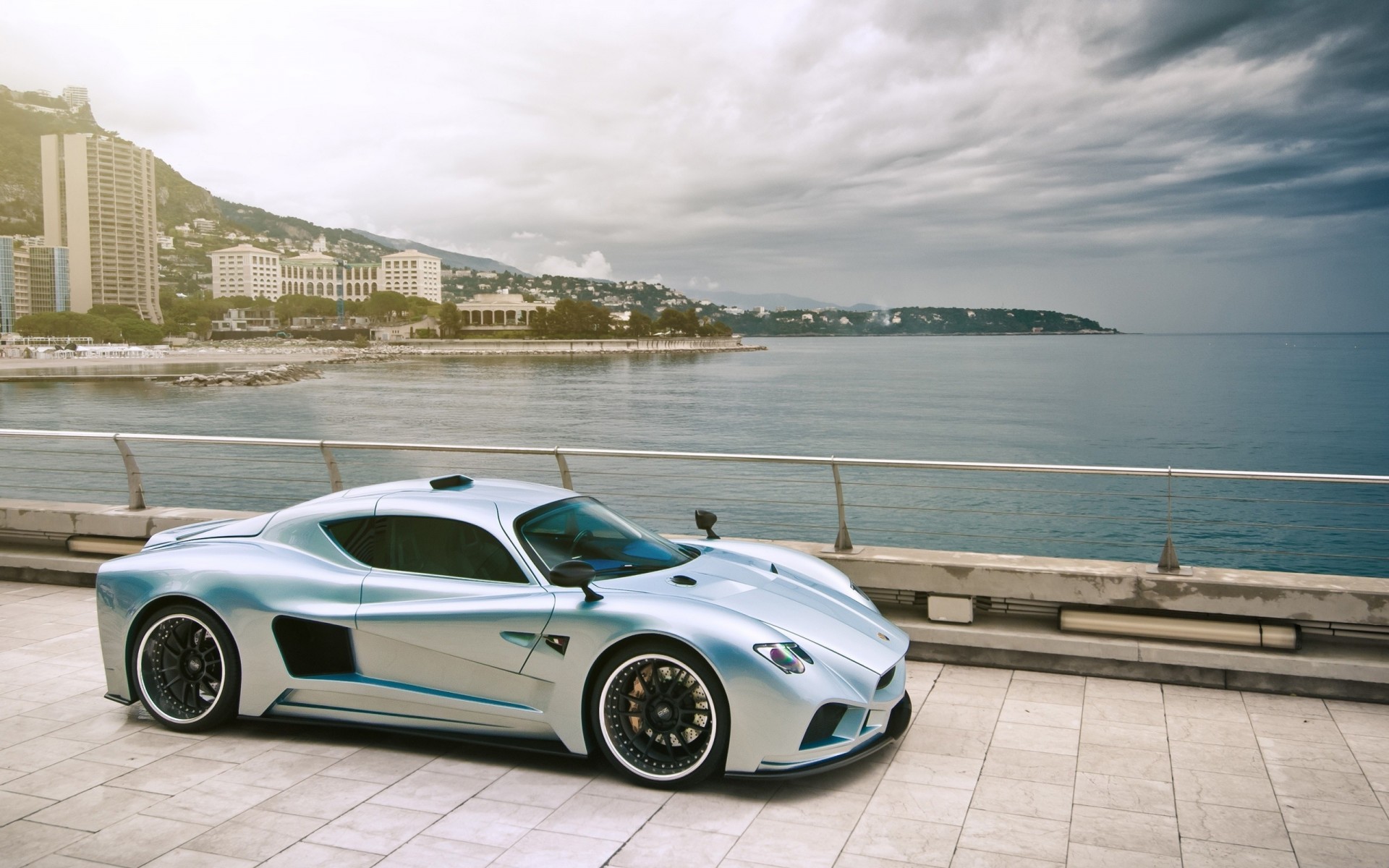 Image of a white sports car against the background of the horizon and the greenery of treesImage of a white sports car against the background of the horizon and the greenery of trees