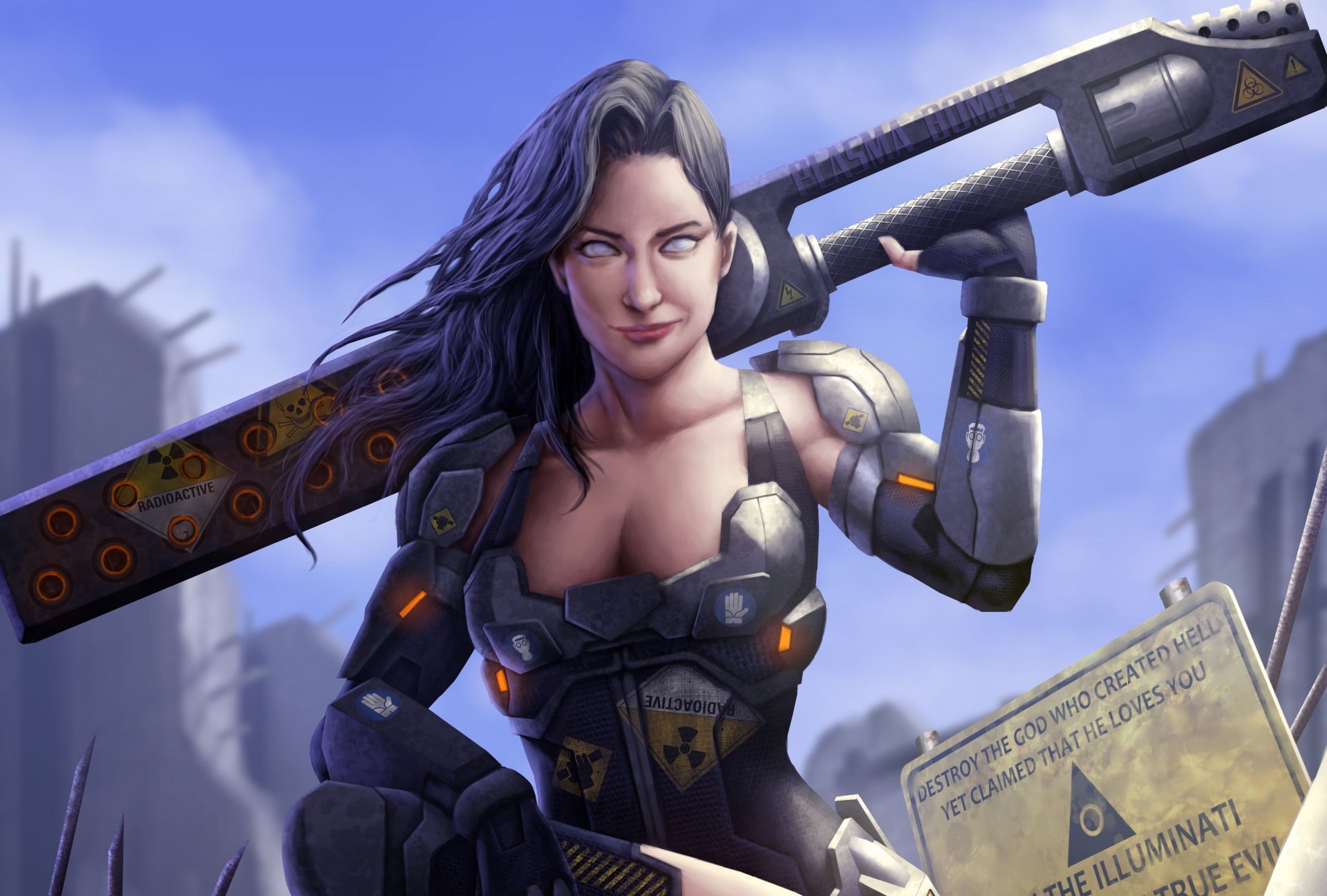 A warrior with swords is covered in dots from a laser at the factoryA warrior with swords is covered in dots from a laser at the factory