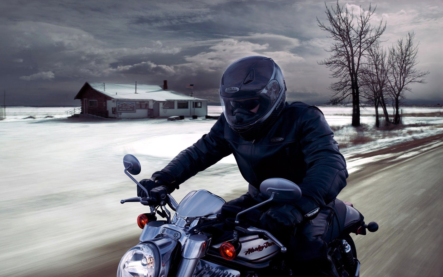 A guy in a helmet on a motorcycle against the background of a winter landscapeA guy in a helmet on a motorcycle against the background of a winter landscape