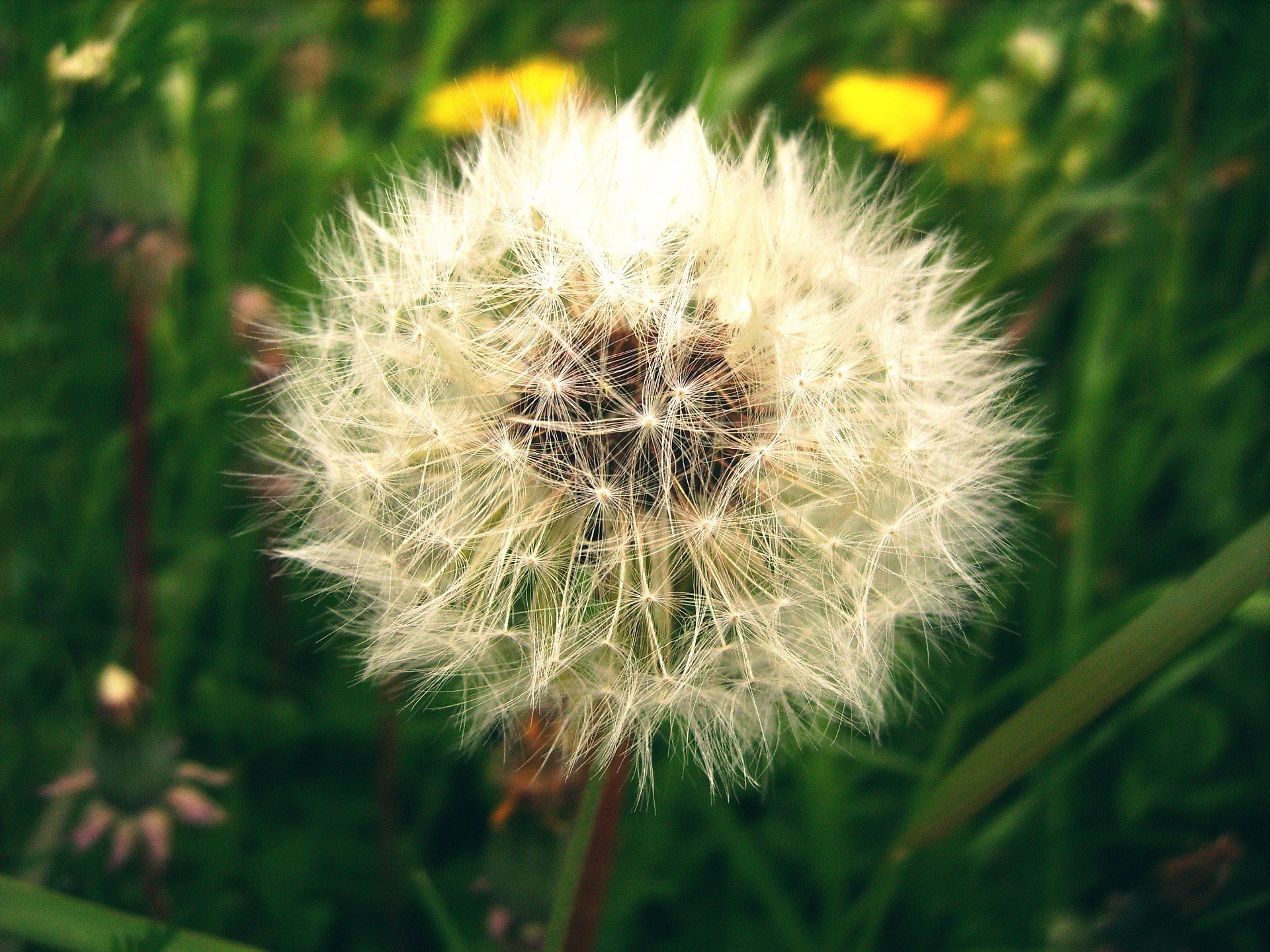 A white dandelion among the green grass